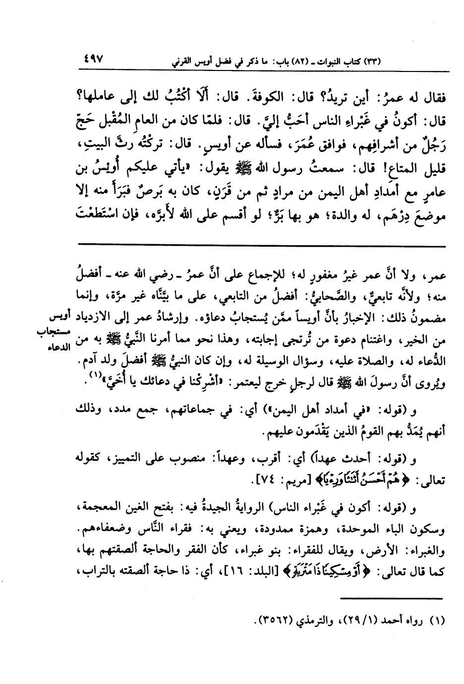 فَقَالَ لَهُ عُمَرُ: أَينَ تُرِيدُ؟ قَالَ: الكُوفَةَ. قَالَ: أَلَا أَكتُبُ لَكَ إِلَى عَامِلِهَا؟ قَالَ: أَكُونُ فِي غَبرَاءِ النَّاسِ أَحَبُّ إِلَيَّ. قَالَ: فَلَمَّا كَانَ مِن العَامِ المُقبِلِ حَجَّ رَجُلٌ مِن أَشرَافِهِم فَوَافَقَ عُمَرَ فَسَأَلَهُ عَن أُوَيسٍ. قَالَ: تَرَكتُهُ رَثَّ البَيتِ قَلِيلَ المَتَاعِ، قَالَ: سَمِعتُ رَسُولَ اللَّهِ صَلَّى اللَّهُ عَلَيهِ وَسَلَّمَ يَقُولُ: يَأتِي عَلَيكُم أُوَيسُ بنُ عَامِرٍ مَعَ أَمدَادِ أَهلِ اليَمَنِ مِن مُرَادٍ ثُمَّ مِن قَرَنٍ، كَانَ بِهِ بَرَصٌ فَبَرَأَ مِنهُ إِلَّا مَوضِعَ دِرهَمٍ، لَهُ وَالِدَةٌ هُوَ بِهَا بَرٌّ، لَو أَقسَمَ عَلَى اللَّهِ لَأَبَرَّهُ، فَإِن استَطَعتَ