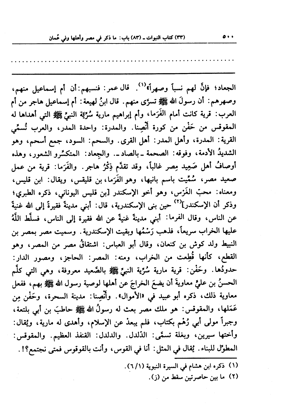 الجعاد، فإنَّ لهم نسبًا وصهرًا (¬1). قال عمر: فنسبهم: أن أم إسماعيل منهم، وصهرهم: أن رسول الله ـ صلى الله عليه وسلم ـ تسرى منهم. قال ابن لهيعة: أم إسماعيل هاجر من أم العرب: قرية كانت أمام الفرما، وأم إبراهيم مارية سرية النبي ـ صلى الله عليه وسلم ـ التي أهداها له المقوقس من حَفن من كورة أنصنا. والمدرة: واحدة المدر، والعرب تسمي القرية: المدرة، وأهل المدر: أهل القرى. والسحم: السود، جمع أسحم، وهو الشديد الأدمة، وفوقه: الصحمة - بالصاد -. والجعاد: المتكسرو الشعور، وهذه أوصاف أهل صعيد مصر غالبًا، وقد تقدَّم ذكر هاجر. والفرما: قرية من عمل صعيد مصر، سميت باسم بانيها، وهو الفرما بن قليقس، ويقال: ابن قليس، ومعناه: محب الغرس، وهو أخو الإسكندر [بن قليس اليوناني، ذكره الطبري، وذكر أن الإسكندر] (¬2) حين بنى الإسكندرية، قال: أبني مدينة فقيرة إلى الله غنية عن الناس، وقال الفرما: أبني مدينة غنية عن الله فقيرة إلى الناس، فسلَّط الله تعالى عليها الخراب سريعًا، فذهب رسمها وبقيت الإسكندرية. وسميت مصر بمصر بن النبيط ولد كوش بن كنعان، وقال أبو العباس: اشتقاق مصر من المصر، وهو القطع، كأنها قُطعت من الخراب، ومنه: المصر: الحاجز، ومصور الدار: حدودها. وحفن: قرية مارية سُرِّية النبي ـ صلى الله عليه وسلم ـ بالصعيد معروفة، وهي التي كلم الحسن بن علي معاوية أن يضع الخراج عن أهلها لوصية رسول الله ـ صلى الله عليه وسلم ـ بهم، ففعل معاوية ذلك، ذكره أبو عبيد في الأموال. وأنصنا: مدينة السحرة، وحفن من عملها، والمقوقس: هو ملك مصر بعث له رسول الله ـ صلى الله عليه وسلم ـ حاطب بن أبي بلتعة، وجبرًا مولى أبي رُهم بكتاب، فلم يبعد عن الإسلام، وأهدى له مارية، ويقال: وأختها سيرين، وبغلة تسمَّى: الدَّلدل. والدلدل: القنفذ العظيم. والمقوقس: المطوِّل للبناء. يقال في المثل: أنا في القوس، وأنت بالقوقوس فمتى نجتمع؟ !