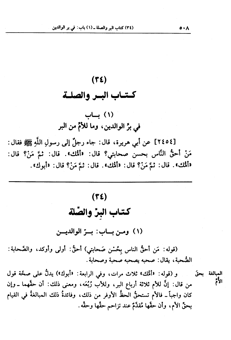 [2454] عَن أَبِي هُرَيرَةَ قَالَ: جَاءَ رَجُلٌ إِلَى رَسُولِ اللَّهِ صَلَّى اللَّهُ عَلَيهِ وَسَلَّمَ فَقَالَ: مَن أَحَقُّ النَّاسِ بِحُسنِ صَحَابَتِي؟ قَالَ: أُمُّكَ. قَالَ: ثُمَّ مَن؟ قَالَ: أُمُّكَ. قَالَ: ثُمَّ مَن؟ قَالَ: أُمُّكَ. قَالَ: ثُمَّ مَن؟ قَالَ: أَبُوكَ.