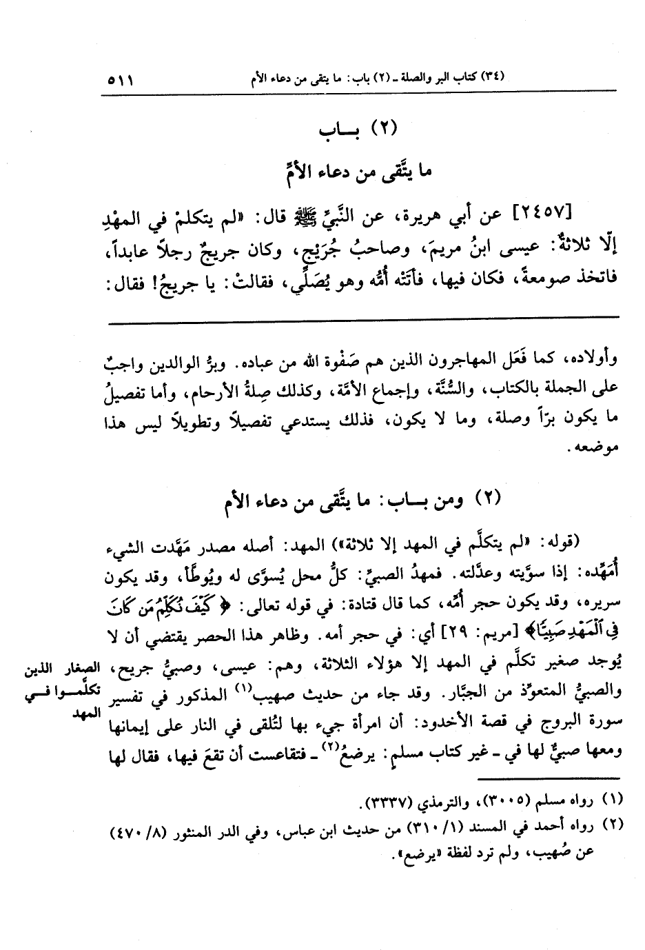 [2457] عَن أَبِي هُرَيرَةَ عَن النَّبِيِّ صَلَّى اللَّهُ عَلَيهِ وَسَلَّمَ قَالَ: لَم يَتَكَلَّم فِي المَهدِ إِلَّا ثَلَاثَةٌ عِيسَى ابنُ مَريَمَ وَصَاحِبُ جُرَيجٍ، وَكَانَ جُرَيجٌ رَجُلًا عَابِدًا فَاتَّخَذَ صَومَعَةً فَكَانَ فِيهَا، فَأَتَتهُ أُمُّهُ وَهُوَ يُصَلِّي فَقَالَت: يَا جُرَيجُ فَقَالَ: