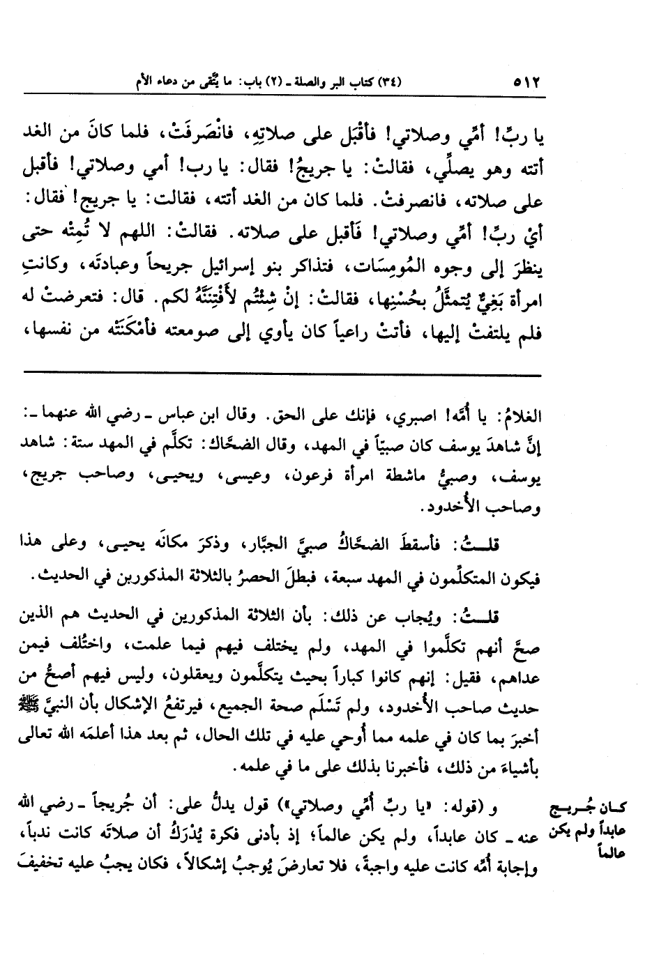 يَا رَبِّ أُمِّي وَصَلَاتِي فَأَقبَلَ عَلَى صَلَاتِهِ فَانصَرَفَت، فَلَمَّا كَانَ مِن الغَدِ أَتَتهُ وَهُوَ يُصَلِّي فَقَالَت: يَا جُرَيجُ فَقَالَ: يَا رَبِّ أُمِّي وَصَلَاتِي، فَأَقبَلَ عَلَى صَلَاتِهِ فَانصَرَفَت، فَلَمَّا كَانَ مِن الغَدِ أَتَتهُ فَقَالَت: يَا جُرَيجُ فَقَالَ: أَي رَبِّ أُمِّي وَصَلَاتِي فَأَقبَلَ عَلَى صَلَاتِهِ فَقَالَت: اللَّهُمَّ لَا تُمِتهُ حَتَّى يَنظُرَ إِلَى وُجُوهِ المُومِسَاتِ، فَتَذَاكَرَ بَنُو إِسرَائِيلَ جُرَيجًا وَعِبَادَتَهُ وَكَانَت امرَأَةٌ بَغِيٌّ يُتَمَثَّلُ بِحُسنِهَا فَقَالَت: إِن شِئتُم لَأَفتِنَنَّهُ لَكُم. قَالَ: فَتَعَرَّضَت لَهُ فَلَم يَلتَفِت إِلَيهَا، فَأَتَت رَاعِيًا كَانَ يَأوِي إِلَى صَومَعَتِهِ فَأَمكَنَتهُ مِن نَفسِهَا