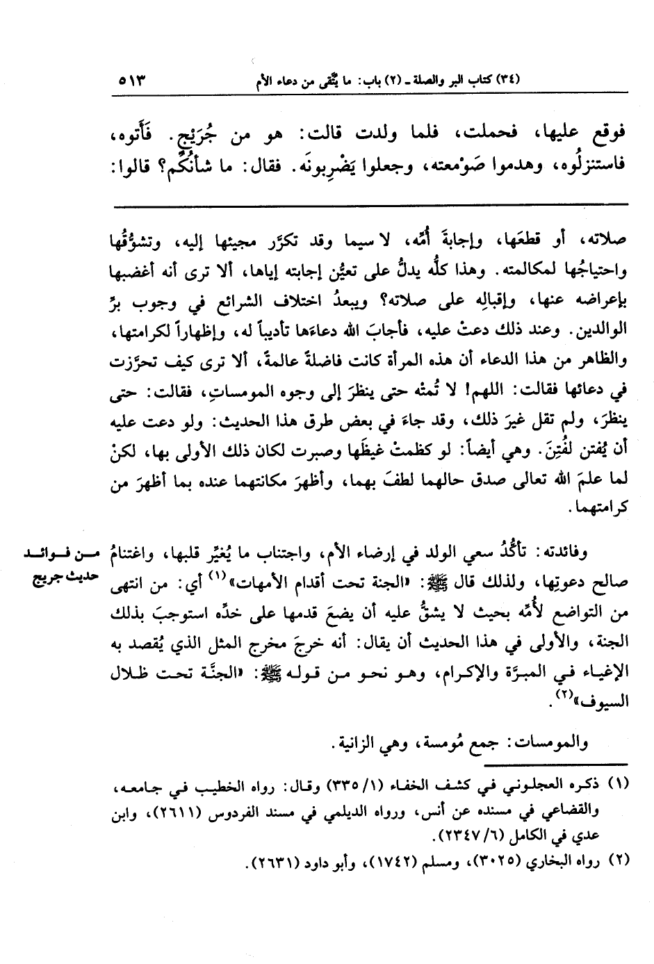 صلاته، أو قطعها، وإجابة أمه، لا سيما وقد تكرر مجيئها إليه، وتشوقها واحتياجها لمكالمته. وهذا كله يدلّ على تعين إجابته إياها، ألا ترى أنه أغضبها بإعراضه عنها، وإقباله على صلاته؟ ويبعد اختلاف الشرائع في وجوب بر الوالدين. وعند ذلك دعت عليه، فأجاب الله دعاءها تأديبا له، وإظهارا لكرامتها، والظاهر من هذا الدعاء أن هذه المرأة كانت فاضلة عالمة، ألا ترى كيف تحرزت في دعائها فقالت: اللهم لا تمته حتى ينظر إلى وجوه المومسات، فقالت: حتى ينظر، ولم تقل غير ذلك، وقد جاء في بعض طرق هذا الحديث: ولو دعت عليه أن يفتن لفتن. وهي أيضًا: لو كظمت غيظها وصبرت لكان ذلك الأولى بها، لكن لما علم الله تعالى صدق حالهما لطف بهما، وأظهر مكانتهما عنده بما أظهر من كرامتهما.