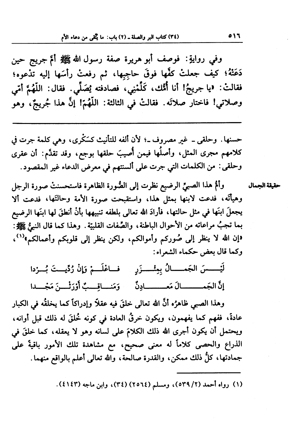 وأم هذا الصبي الرضيع نظرت إلى الصورة الظاهرة فاستحسنت صورة الرجل وهيأته، فدعت لابنها بمثل هذا، واستقبحت صورة الأمة وحالتها، فدعت ألا يجعل ابنها في مثل حالتها، فأراد الله تعالى بلطفه تنبيهها بأن أنطق لها ابنها الرضيع بما تجب مراعاته من الأحوال الباطنة، والصفات القلبية. وهذا كما قال النبي صَلَّى اللَّهُ عَلَيهِ وَسَلَّمَ: إن الله لا ينظر إلى صوركم وأموالكم، ولكن ينظر إلى قلوبكم وأعمالكم (¬1)، وكما قال بعض حكماء الشعراء: