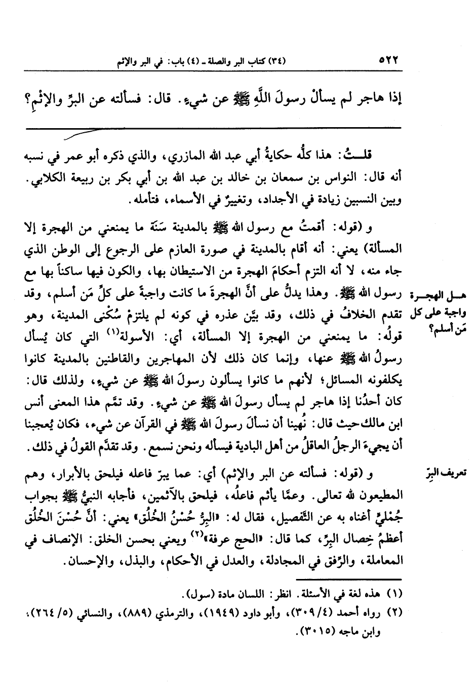 إِذَا هَاجَرَ لَم يَسأَل رَسُولَ اللَّهِ صَلَّى اللَّهُ عَلَيهِ وَسَلَّمَ عَن شَيءٍ، قَالَ: فَسَأَلتُهُ عَن البِرِّ وَالإِثمِ،