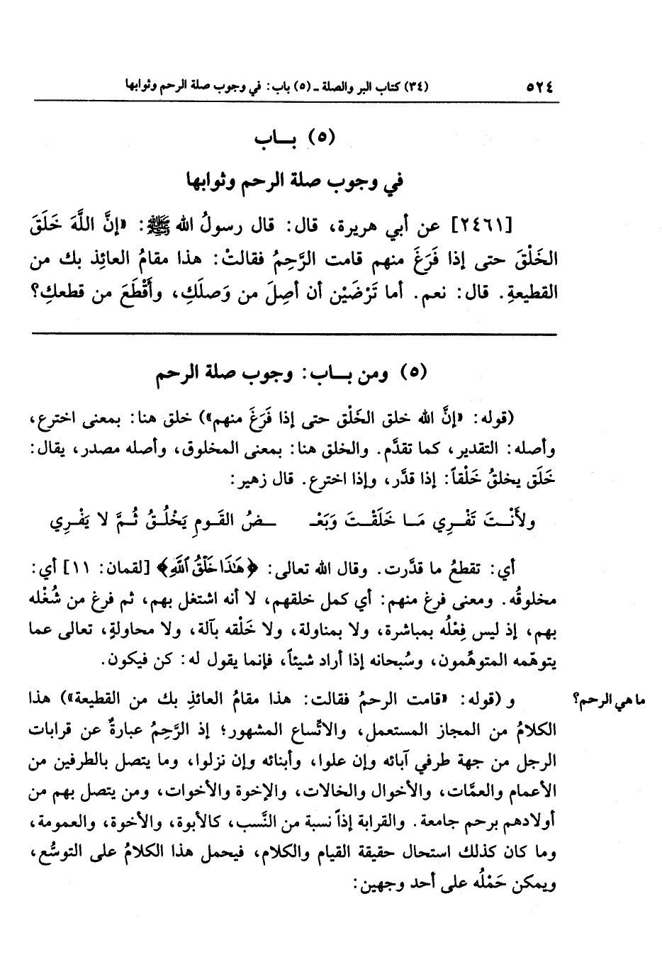[2461] عَن أَبِي هُرَيرَةَ قَالَ: قَالَ رَسُولُ اللَّهِ صَلَّى اللَّهُ عَلَيهِ وَسَلَّمَ: إِنَّ اللَّهَ خَلَقَ الخَلقَ حَتَّى إِذَا فَرَغَ مِنهُم قَامَت الرَّحِمُ، فَقَالَت: هَذَا مَقَامُ العَائِذِ بك مِن القَطِيعَةِ قَالَ: نَعَم، أَمَا تَرضَينَ أَن أَصِلَ مَن وَصَلَكِ، وَأَقطَعَ مَن قَطَعَكِ؟