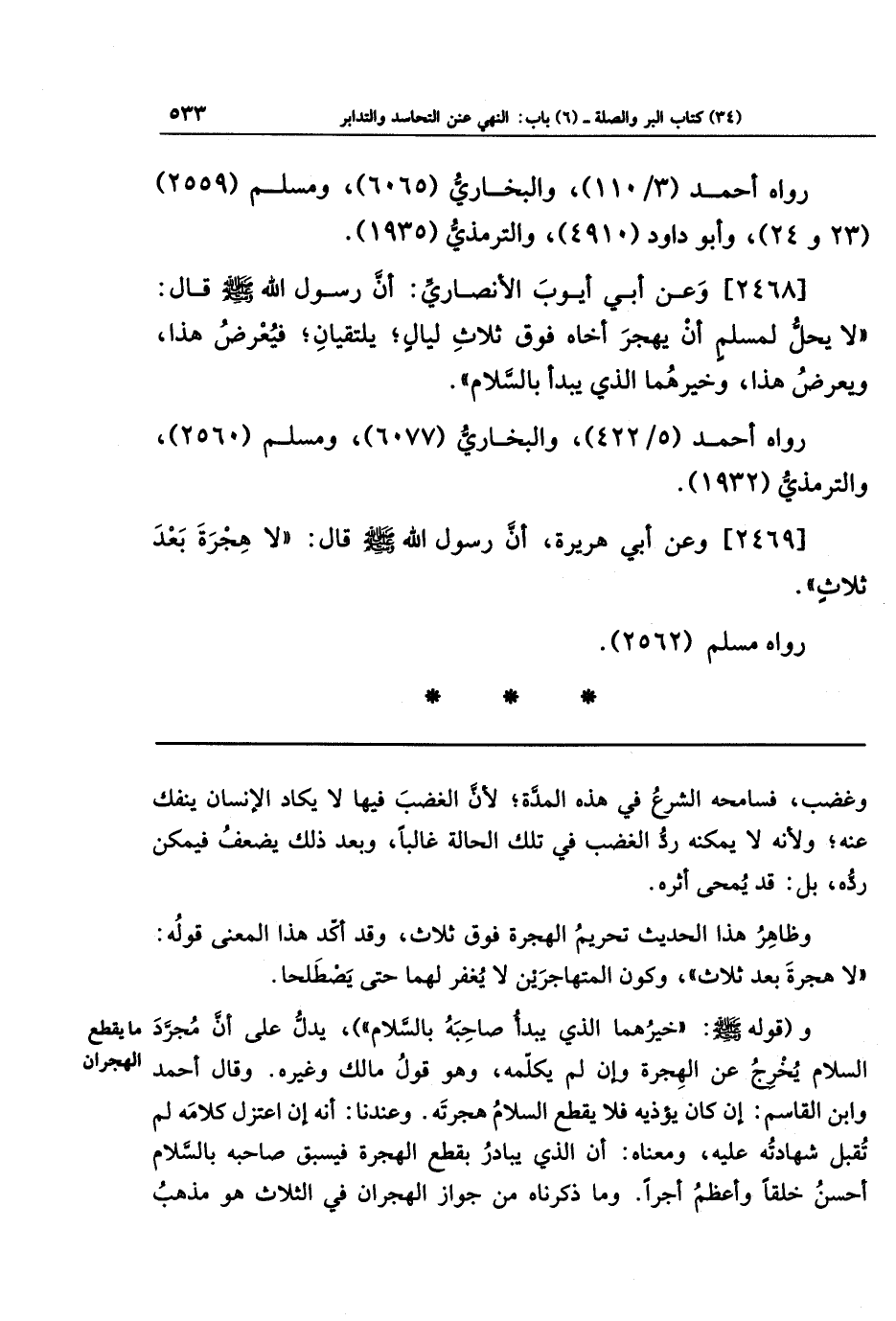 [2468] وعَن أَبِي أَيُّوبَ الأَنصَارِيِّ أَنَّ رَسُولَ اللَّهِ صَلَّى اللَّهُ عَلَيهِ وَسَلَّمَ قَالَ: لَا يَحِلُّ لِمُسلِمٍ أَن يَهجُرَ أَخَاهُ فَوقَ ثَلَاثِ لَيَالٍ يَلتَقِيَانِ فَيُعرِضُ هَذَا، وَيُعرِضُ هَذَا، وَخَيرُهُمَا الَّذِي يَبدَأُ بِالسَّلَامِ.