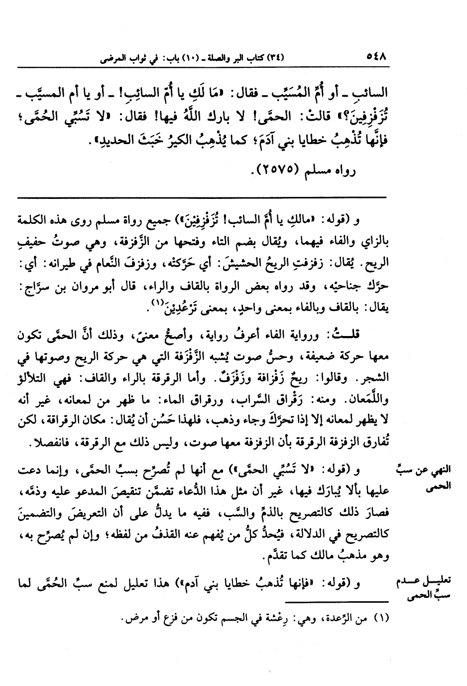 السَّائِبِ - أَو أُمِّ المُسَيَّبِ - فَقَالَ: مَا لَكِ يَا أُمَّ السَّائِبِ - أَو يَا أُمَّ المُسَيَّبِ - تُزَفزِفِينَ؟ قَالَت: الحُمَّى! لَا بَارَكَ اللَّهُ فِيهَا، فَقَالَ: لَا تَسُبِّي الحُمَّى فَإِنَّهَا تُذهِبُ خَطَايَا بَنِي آدَمَ، كَمَا يُذهِبُ الكِيرُ خَبَثَ الحَدِيدِ.