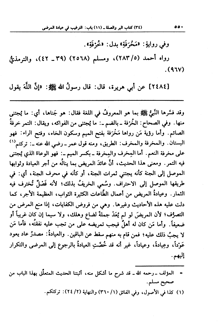 وقد فسرها النبي صلى الله عليه وسلم بما هو المعروف في اللغة فقال: هو جناها، أي: ما يجتنى منها. وفي الصحاح: الخرفة - بالضم -: ما يجتنى من الفواكه، ويقال: التمر خرفة الصائم. وأما رؤية من رواها مخرفة بفتح الميم وسكون الخاء، وفتح الراء: فهو البستان. والمخرفة والمخرف: الطريق، ومنه قول عمر - رضي الله عنه -: تركتم (¬1) على مخرفة النعم. أما المخرف والمخرفة - بكسر الميم -: فهو الوعاء الذي يجتنى فيه التمر. ومعنى هذا الحديث، أن عائد المريض بما يناله من أجر العيادة وثوابها الموصل إلى الجنة كأنه يجتني ثمرات الجنة، أو كأنه في محرف الجنة، أي: في طريقها الموصل إلى الاحتراف. وسمي الخريف بذلك، لأنَّه فضل تخترف فيه الثمار. وعيادة المريض من أعمال الطاعات الكثيرة الثواب، العظيمة الأجر، كما دلت عليه هذه الأحاديث وغيرها. وهي من فروض الكفايات، إذا منع المرض من التصرف، لأنَّ المريض لو لم يعد جملة لضاع وهلك، ولا سيما إن كان غريبا أو ضعيفا. وأما من كان له أهل فيجب تمريضه على من تجب عليه نفقته، فأمَّا من لا يجب ذلك عليه؛ فمن قام به منهم سقط عن الباقين. والعيادة: مصدر عاد يعود عودا، وعيادة، وعيادا، غير أنه قد خصت العيادة بالرجوع إلى المرضى والتكرار إليهم.