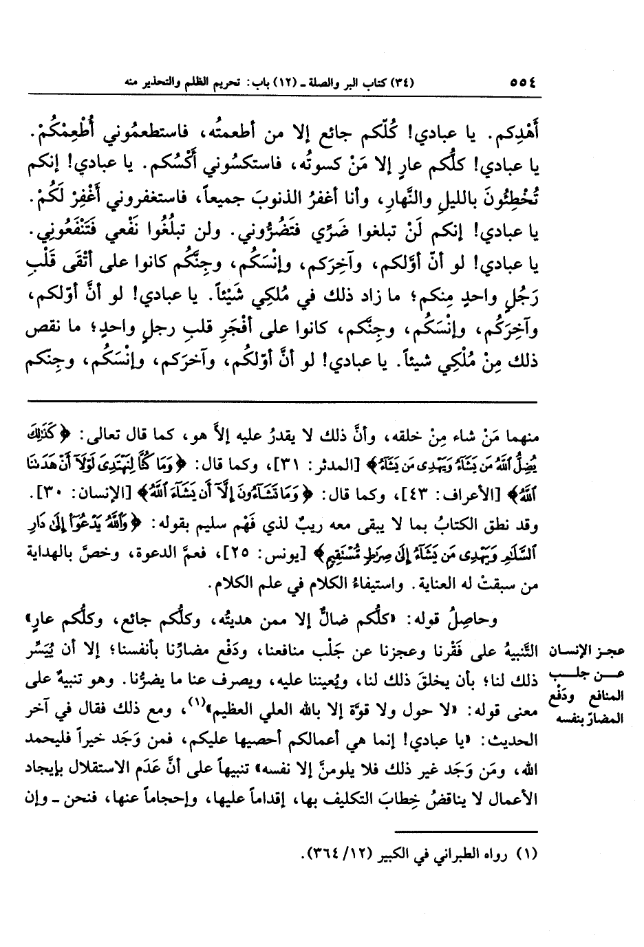 أَهدِكُم، يَا عِبَادِي كُلُّكُم جَائِعٌ إِلَّا مَن أَطعَمتُهُ فَاستَطعِمُونِي أُطعِمكُم، يَا عِبَادِي كُلُّكُم عَارٍ إِلَّا مَن كَسَوتُهُ فَاستَكسُونِي أَكسُكُم، يَا عِبَادِي إِنَّكُم تُخطِئُونَ بِاللَّيلِ وَالنَّهَارِ وَأَنَا أَغفِرُ الذُّنُوبَ جَمِيعًا، فَاستَغفِرُونِي أَغفِر لَكُم، يَا عِبَادِي إِنَّكُم لَن تَبلُغُوا ضَرِّي فَتَضُرُّونِي، وَلَن تَبلُغُوا نَفعِي فَتَنفَعُونِي، يَا عِبَادِي لَو أَنَّ أَوَّلَكُم وَآخِرَكُم وَإِنسَكُم وَجِنَّكُم كَانُوا عَلَى أَتقَى قَلبِ رَجُلٍ وَاحِدٍ مِنكُم مَا زَادَ ذَلِكَ فِي مُلكِي شَيئًا، يَا عِبَادِي لَو أَنَّ أَوَّلَكُم وَآخِرَكُم وَإِنسَكُم وَجِنَّكُم كَانُوا عَلَى أَفجَرِ قَلبِ رَجُلٍ وَاحِدٍ مَا نَقَصَ ذَلِكَ مِن مُلكِي شَيئًا، يَا عِبَادِي لَو أَنَّ أَوَّلَكُم وَآخِرَكُم وَإِنسَكُم وَجِنَّكُم