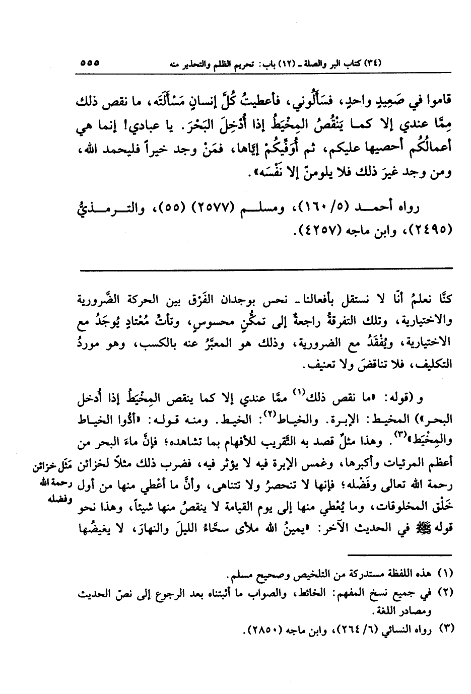 قَامُوا فِي صَعِيدٍ وَاحِدٍ فَسَأَلُونِي فَأَعطَيتُ كُلَّ إِنسَانٍ مَسأَلَتَهُ مَا نَقَصَ ذَلِكَ مِمَّا عِندِي إِلَّا كَمَا يَنقُصُ المِخيَطُ إِذَا أُدخِلَ البَحرَ، يَا عِبَادِي إِنَّمَا هِيَ أَعمَالُكُم أُحصِيهَا علَيكُم ثُمَّ أُوَفِّيكُم إِيَّاهَا، فَمَن وَجَدَ خَيرًا فَليَحمَد اللَّهَ، وَمَن وَجَدَ غَيرَ ذَلِكَ فَلَا يَلُومَنَّ إِلَّا نَفسَهُ.