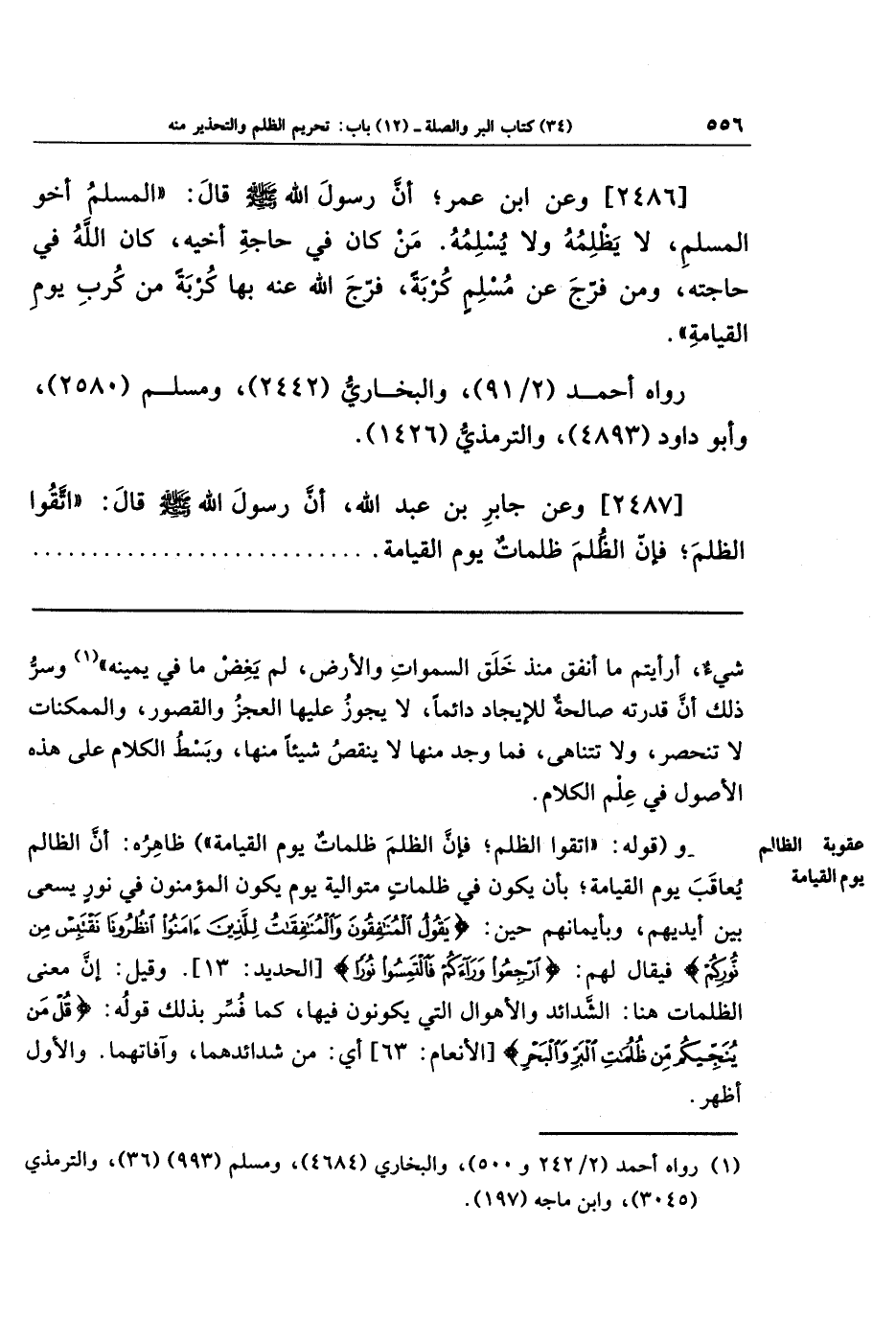 [2486] وعن ابن عمر أَنَّ رَسُولَ اللَّهِ صَلَّى اللَّهُ عَلَيهِ وَسَلَّمَ قَالَ: المُسلِمُ أَخُو المُسلِمِ لَا يَظلِمُهُ، وَلَا يُسلِمُهُ، مَن كَانَ فِي حَاجَةِ أَخِيهِ كَانَ اللَّهُ فِي حَاجَتِهِ، وَمَن فَرَّجَ عَن مُسلِمٍ كُربَةً فَرَّجَ اللَّهُ عَنهُ بِهَا كُربَةً مِن كُرَبِ يَومِ القِيَامَةِ.