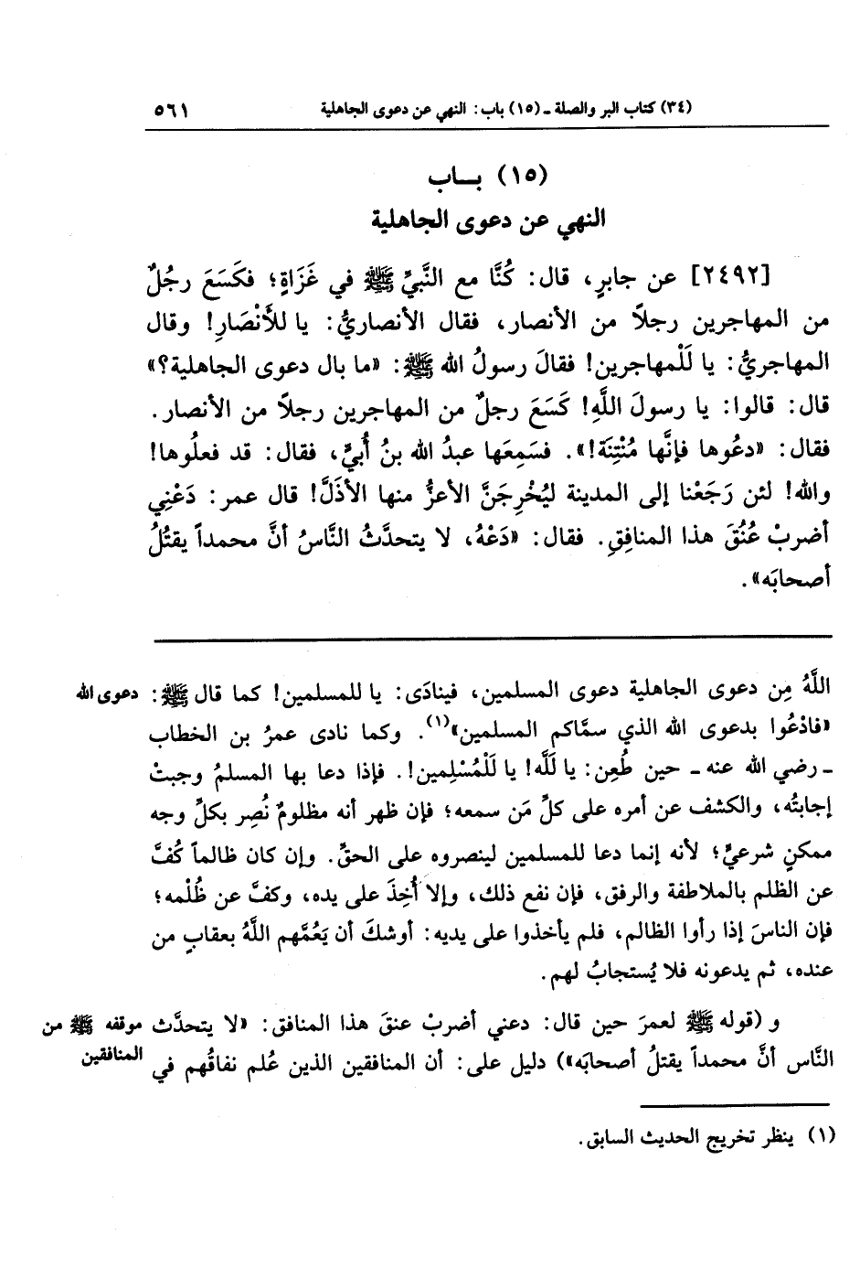 [2492] عن جَابِرَ قال: كُنَّا مَعَ النَّبِيِّ صَلَّى اللَّهُ عَلَيهِ وَسَلَّمَ فِي غَزَاةٍ فَكَسَعَ رَجُلٌ مِن المُهَاجِرِينَ رَجُلًا مِن الأَنصَارِ فَقَالَ الأَنصَارِيُّ: يَا لَلأَنصَارِ! وَقَالَ المُهَاجِرِيُّ: يَا لَلمُهَاجِرِينَ! فَقَالَ رَسُولُ اللَّهِ صَلَّى اللَّهُ عَلَيهِ وَسَلَّمَ: مَا بَالُ دَعوَى الجَاهِلِيَّةِ؟ قال: قَالُوا: يَا رَسُولَ اللَّهِ كَسَعَ رَجُلٌ مِن المُهَاجِرِينَ رَجُلًا مِن الأَنصَارِ، فَقَالَ: دَعُوهَا فَإِنَّهَا مُنتِنَةٌ، فَسَمِعَهَا عَبدُ اللَّهِ بنُ أُبَيٍّ، فَقَالَ: قَد فَعَلُوهَا وَاللَّهِ! لَئِن رَجَعنَا إِلَى المَدِينَةِ لَيُخرِجَنَّ الأَعَزُّ مِنهَا الأَذَلَّ. قَالَ عُمَرُ: دَعنِي أَضرِبُ عُنُقَ هَذَا المُنَافِقِ، فَقَالَ: دَعهُ، لَا يَتَحَدَّثُ النَّاسُ أَنَّ مُحَمَّدًا يَقتُلُ أَصحَابَهُ.