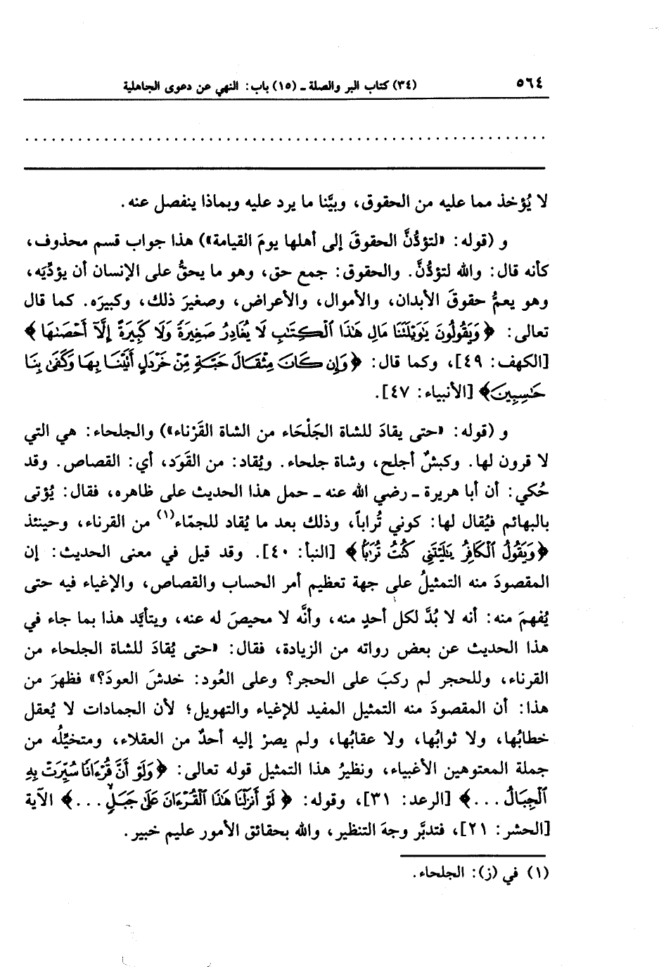 و(قوله: حتى يقاد للشاة الجلحاء من الشاة القرناء) والجلحاء: هي التي لا قرون لها. وكبش أجلح، وشاة جلحاء. ويقاد: من القود، أي: القصاص. وقد حكي أن أبا هريرة - رضي الله عنه - حمل هذا الحديث على ظاهره، فقال: يؤتى بالبهائم فيقال لها: كوني ترابا، وذلك بعدما يقاد للجماء (¬1) من القرناء، وحينئذ: {وَيَقُولُ الكَافِرُ يَا لَيتَنِي كُنتُ تُرَابًا} وقد قيل في معنى الحديث: إن المقصود منه التمثيل على جهة تعظيم أمر الحساب والقصاص، والإغياء فيه حتى يفهم منه: أنه لا بد لكل أحد منه، وأنه لا محيص له عنه، ويتأيد هذا بما جاء في هذا الحديث عن بعض رواته من الزيادة، فقال: حتى يقاد للشاة الجلحاء من القرناء، وللحجر لم ركب على الحجر وعلى العود خدش العود فظهر من هذا: أن المقصود منه التمثيل المفيد للإغياء والتهويل، لأنَّ الجمادات لا يعقل خطابها ولا ثوابها ولا عقابها، ولم يصر إليه أحد من العقلاء، ومتخيله من جملة المعتوهين الأغبياء، ونظير هذا التمثيل قوله تعالى: {وَلَو أَنَّ قُرآنًا سُيِّرَت بِهِ الجِبَالُ} وقوله: {لَو أَنزَلنَا هَذَا القُرآنَ عَلَى جَبَلٍ} الآية، فتدبر وجه التنظير، والله بحقائق الأمور عليم خبير.