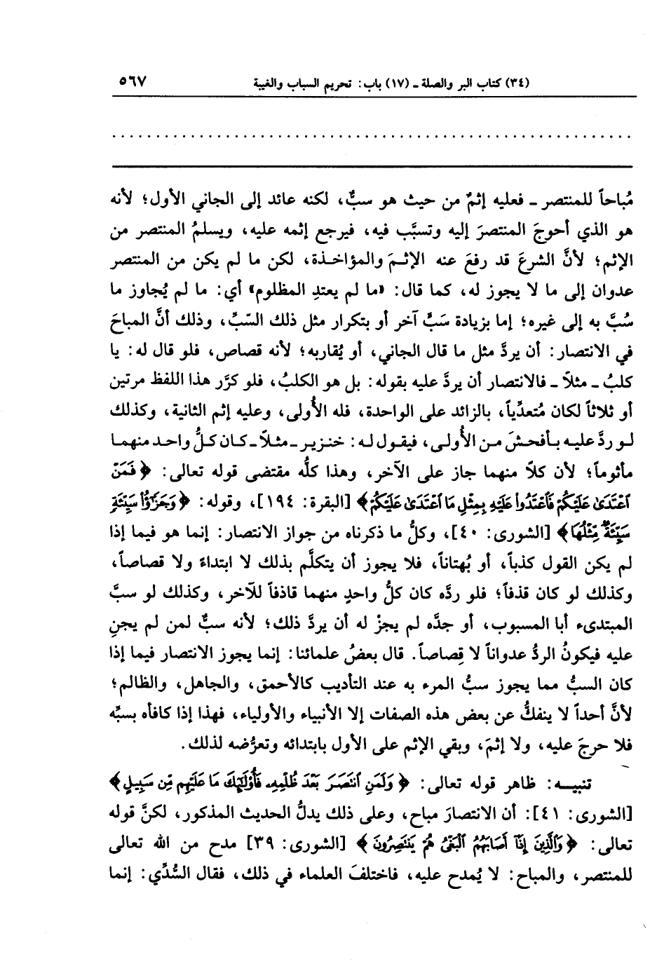 مباحًا للمنتصر - فعليه إثم من حيث هو سب، لكنه عائد إلى الجاني الأول، لأنَّه هو الذي أحوج المنتصر إليه وتسبب فيه، فيرجع إثمه عليه، ويسلم المنتصر من الإثم، لأنَّ الشرع قد رفع عنه الإثم والمؤاخذة، لكن ما لم يكن من المنتصر عدوان إلى ما لا يجوز له، كما قال: ما لم يعتد المظلوم أي: ما لم يجاوز ما سُب به إلى غيره، إما بزيادة سب آخر أو بتكرار مثل ذلك السب، وذلك أن المباح في الانتصار: أن يرد مثل ما قال الجاني، أو يقاربه، لأنَّه قصاص، فلو قال له: يا كلب - مثلا - فالانتصار أن يرد عليه بقوله: بل هو الكلب، فلو كرر هذا اللفظ مرتين أو ثلاثا لكان متعديا بالزائد على الواحدة، فله الأولى، وعليه إثم الثانية، وكذلك لو رد عليه بأفحش من الأولى، فيقول له: خنزير - مثلا - كان كل واحد منهما مأثوما، لأنَّ كلا منهما جار على الآخر، وهذا كله مقتضى قوله تعالى: {فَمَنِ اعتَدَى عَلَيكُم فَاعتَدُوا عَلَيهِ بِمِثلِ مَا اعتَدَى عَلَيكُم} وقوله: {وَجَزَاءُ سَيِّئَةٍ سَيِّئَةٌ مِثلُهَا}