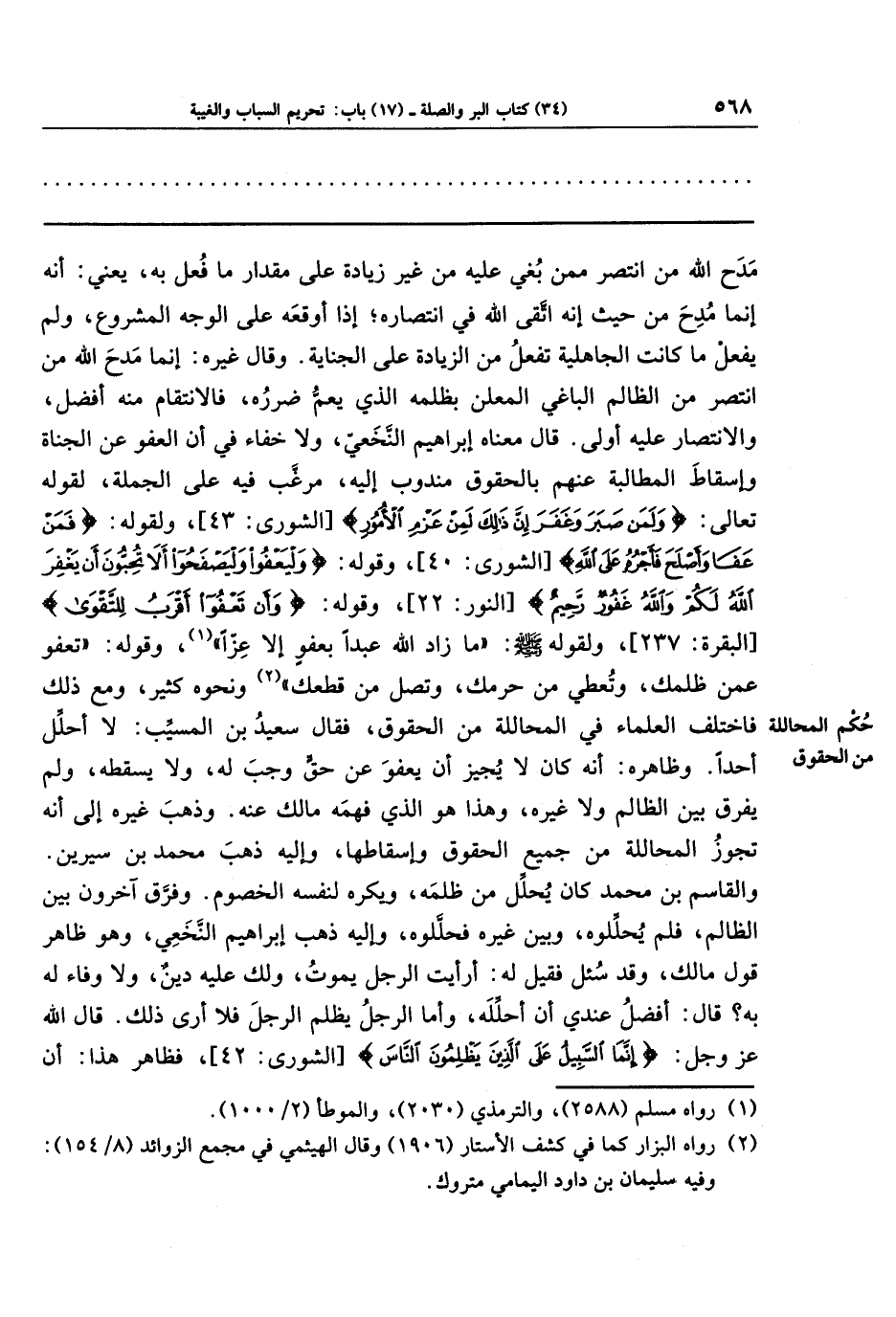 مدح الله من انتصر ممن بغي عليه من غير زيادة على مقدار ما فُعل به، يعني: أنه إنما مدح من حيث إنه اتقى الله في انتصاره، إذا أوقعه على الوجه المشروع، ولم يفعل ما كانت الجاهلية تفعل من الزيادة على الجناية. وقال غيره: إنما مدح الله من انتصر من الظالم الباغي المعلن بظلمه الذي يعُم ضرره، فالانتقام منه أفضل، والانتصار عليه أولى. قال معناه إبراهيم النخعي، ولا خفاء في أن العفو عن الجناة وإسقاط المطالبة عنهم بالحقوق، مندوب إليه، مرغّب فيه على الجملة، لقوله تعالى: {وَلَمَن صَبَرَ وَغَفَرَ إِنَّ ذَلِكَ لَمِن عَزمِ الأُمُورِ} ولقوله: {فَمَن عَفَا وَأَصلَحَ فَأَجرُهُ عَلَى اللَّهِ} وقوله: {وَليَعفُوا وَليَصفَحُوا أَلا تُحِبُّونَ أَن يَغفِرَ اللَّهُ لَكُم وَاللَّهُ غَفُورٌ رَحِيمٌ} وقوله: {وَأَن تَعفُوا أَقرَبُ لِلتَّقوَى} ولقوله صلى الله عليه وسلم: ما زاد الله عبدا بعفو إلا عزا (¬1)، وقوله: تعفو عمن ظلمك، وتعطي من حرمك، وتصل من قطعك (¬2) ونحوه كثير، ومع ذلك فاختلف العلماء في المحاللة من الحقوق، فقال سعيد بن المسيب: لا أحلل أحدا. وظاهره: أنه كان لا يجيز أن يعفو عن حق وجب له، ولا يسقطه، ولم يفرق بين الظالم ولا غيره، وهذا هو الذي فهمه مالك عنه.