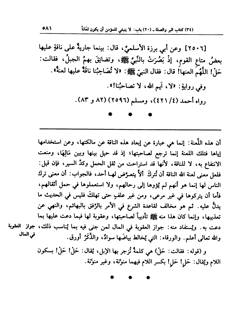 [2506] وعَن أَبِي بَرزَةَ الأَسلَمِيِّ قَالَ: بَينَمَا جَارِيَةٌ عَلَى نَاقَةٍ عَلَيهَا بَعضُ مَتَاعِ القَومِ، إِذ بَصُرَت بِالنَّبِيِّ صَلَّى اللَّهُ عَلَيهِ وَسَلَّمَ، وَتَضَايَقَ بِهِم الجَبَلُ، فَقَالَت: حَل! اللَّهُمَّ العَنهَا، قَالَ: فَقَالَ النَّبِيُّ صَلَّى اللَّهُ عَلَيهِ وَسَلَّمَ: لَا تُصَاحِبنَا نَاقَةٌ عَلَيهَا لَعنَةٌ.