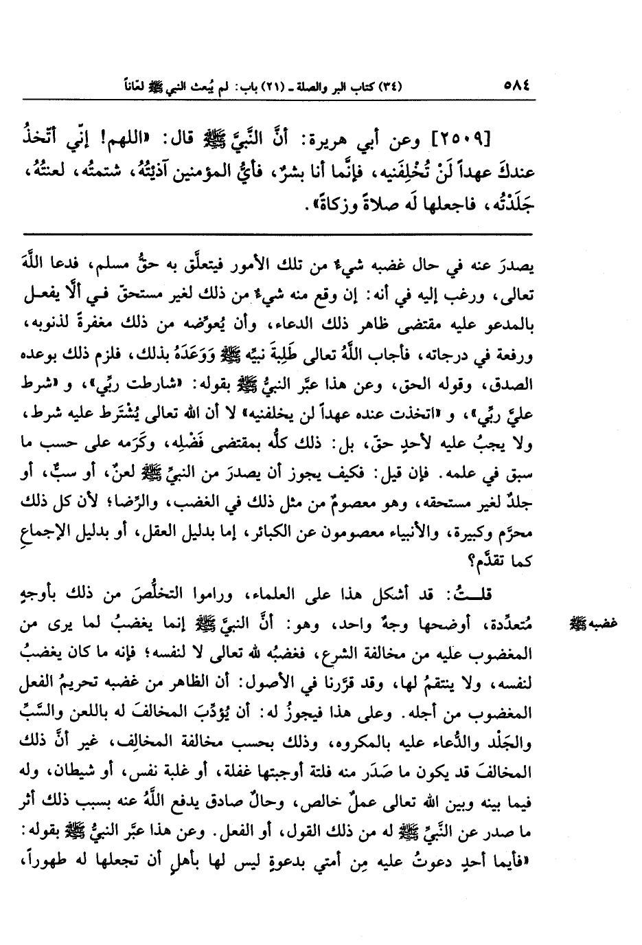 فإن قيل: فكيف يجوز أن يصدر من النبي صلى الله عليه وسلم لعن أو سب، أو جلد لغير مستحقه، وهو معصوم من مثل ذلك في الغضب والرضا؛ لأنَّ كل ذلك محرم وكبيرة، والأنبياء معصومون عن الكبائر، إما بدليل العقل، أو بدليل الإجماع، كما تقدَّم.
