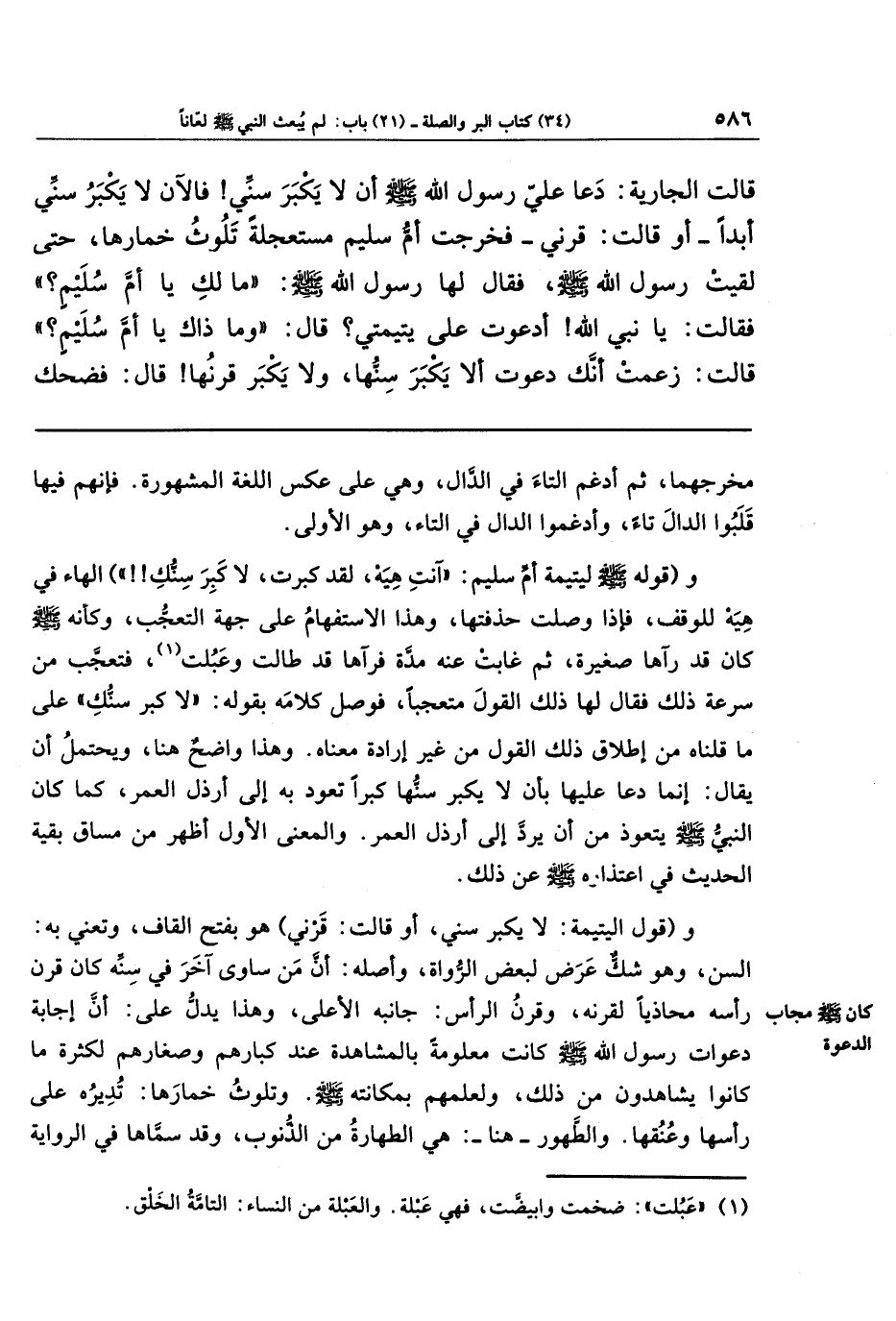 قَالَت الجَارِيَةُ: دَعَا عَلَيَّ رسول اللَّهِ صَلَّى اللَّهُ عَلَيهِ وَسَلَّمَ أَن لَا يَكبَرَ سِنِّي، فَالآنَ لَا يَكبَرُ سِنِّي أَبَدًا - أَو قَالَت: قَرنِي - فَخَرَجَت أُمُّ سُلَيمٍ مُستَعجِلَةً تَلُوثُ خِمَارَهَا حَتَّى لَقِيَت رَسُولَ اللَّهِ صَلَّى اللَّهُ عَلَيهِ وَسَلَّمَ، فَقَالَ لَهَا رَسُولُ اللَّهِ صَلَّى اللَّهُ عَلَيهِ وَسَلَّمَ: مَا لَكِ يَا أُمَّ سُلَيمٍ؟ فَقَالَت: يَا نَبِيَّ اللَّهِ، أَدَعَوتَ عَلَى يَتِيمَتِي؟ قَالَ: وَمَا ذَاكِ يَا أُمَّ سُلَيمٍ؟ قَالَت: زَعَمَت أَنَّكَ دَعَوتَ ألَا يَكبَرَ سِنُّهَا، وَلَا يَكبَرَ قَرنُهَا، قَالَ: فَضَحِكَ