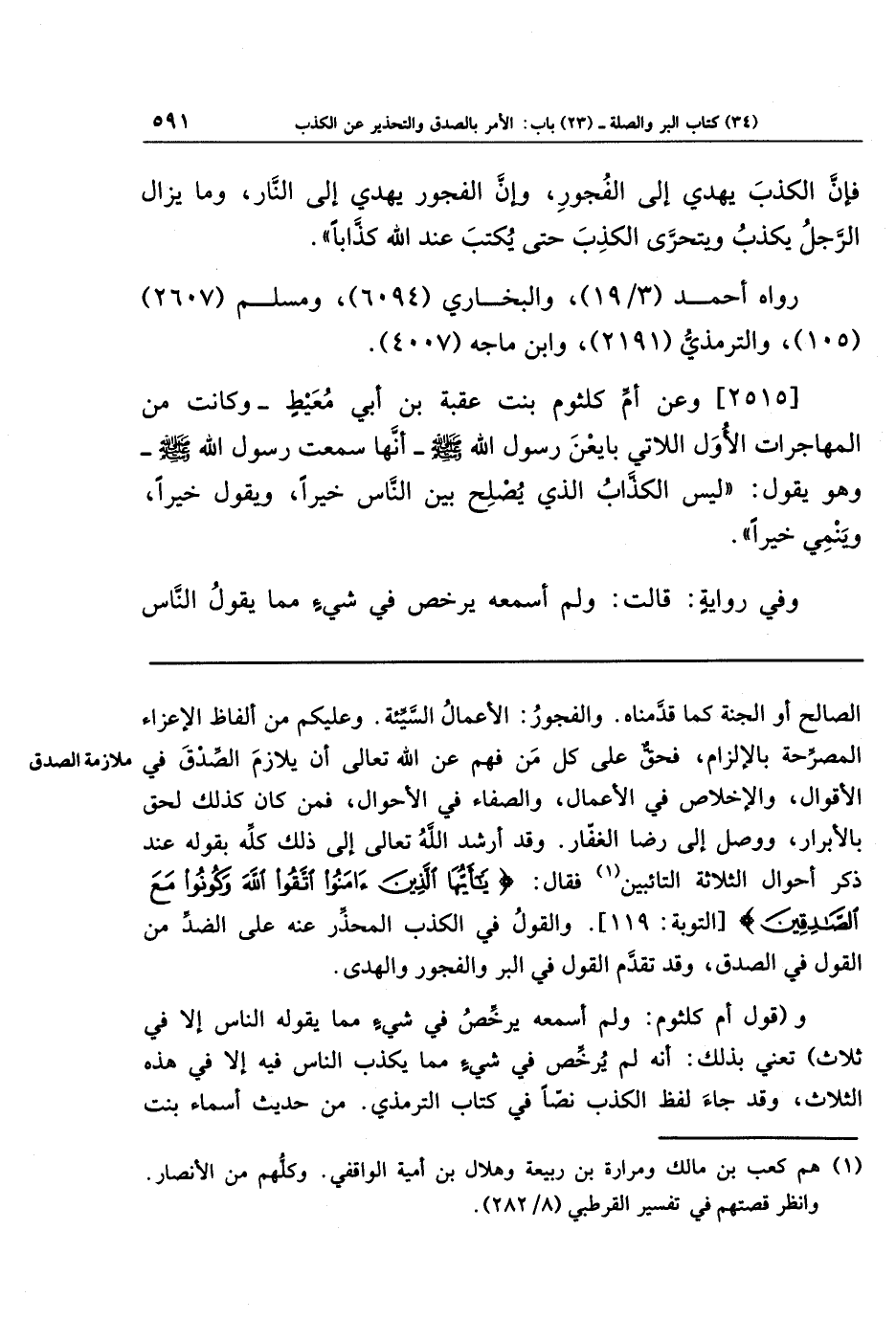 [2515] وعن أُمَّ كُلثُومٍ بِنتَ عُقبَةَ بنِ أَبِي مُعَيطٍ - وَكَانَت مِن المُهَاجِرَاتِ الأُوَلِ اللَّاتِي بَايَعنَ رسول الله صَلَّى اللَّهُ عَلَيهِ وَسَلَّمَ - أَنَّهَا سَمِعَت رَسُولَ اللَّهِ صَلَّى اللَّهُ عَلَيهِ وَسَلَّمَ وَهُوَ يَقُولُ: لَيسَ الكَذَّابُ الَّذِي يُصلِحُ بَينَ النَّاسِ خيرا وَيَقُولُ خَيرًا وَيَنمِي خَيرًا.