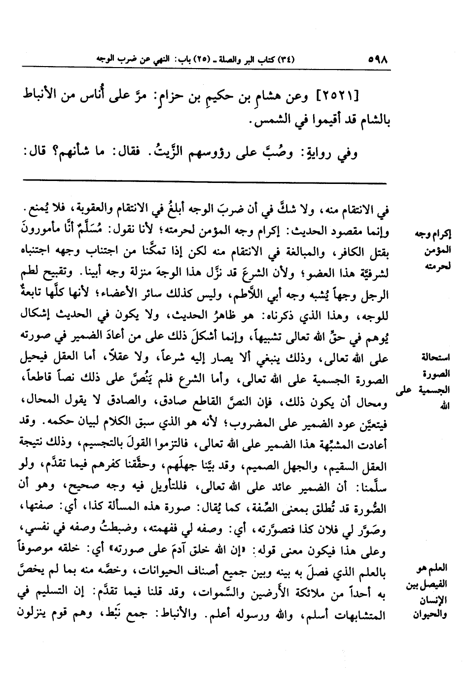 [2521] وعَن هِشَامٍ بنُ حَكِيمِ بنِ حِزَامٍ: مَرَّ عَلَى أُنَاسٍ مِن الأَنبَاطِ بِالشَّامِ قَد أُقِيمُوا فِي الشَّمسِ.