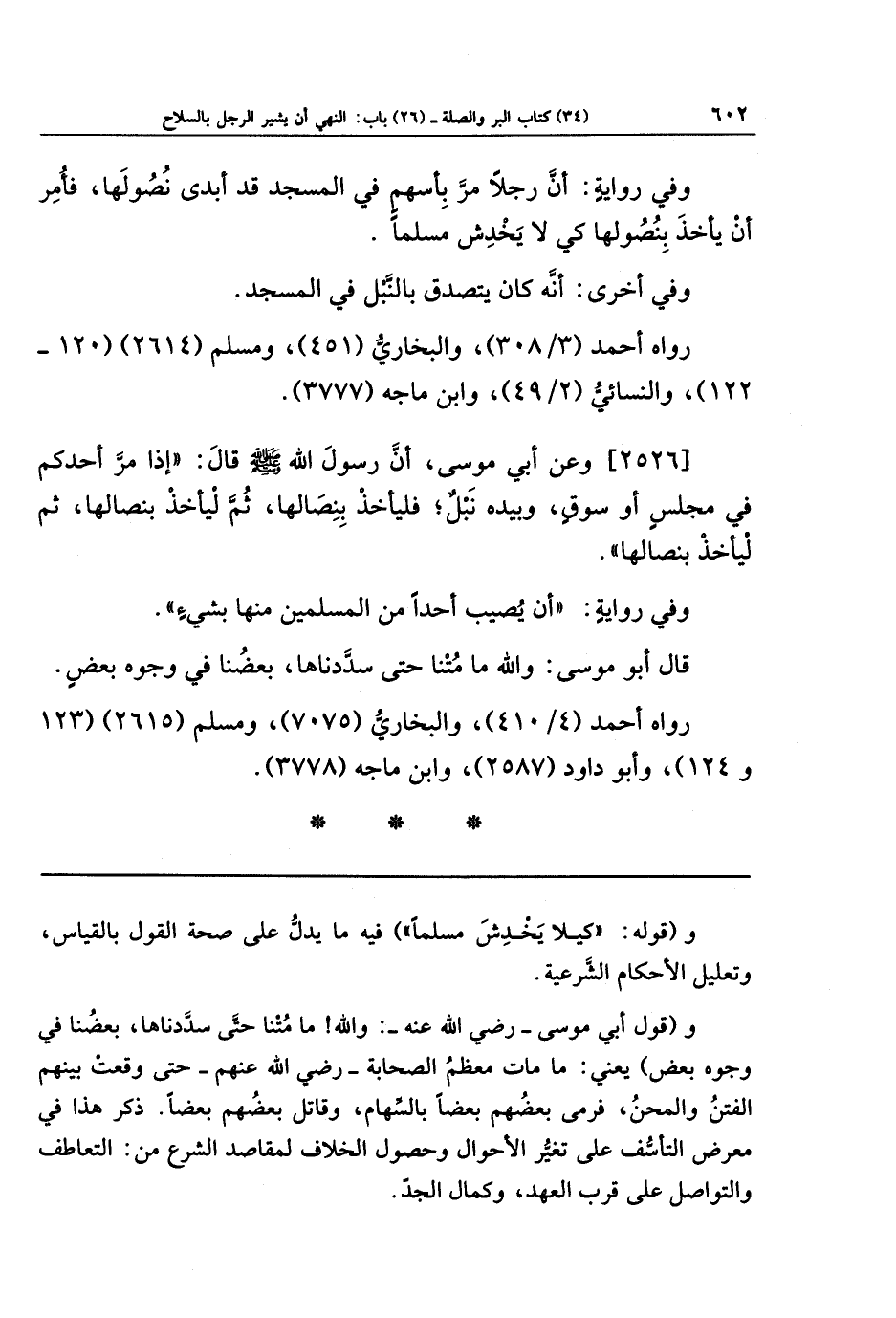 [2526] وعَن أَبِي مُوسَى أَنَّ رَسُولَ اللَّهِ صَلَّى اللَّهُ عَلَيهِ وَسَلَّمَ قَالَ: إِذَا مَرَّ أَحَدُكُم فِي مَجلِسٍ أَو سُوقٍ، وَبِيَدِهِ نَبلٌ، فَليَأخُذ بِنِصَالِهَا، ثُمَّ لِيَأخُذ بِنِصَالِهَا، ثُمَّ لِيَأخُذ بِنِصَالِهَا.