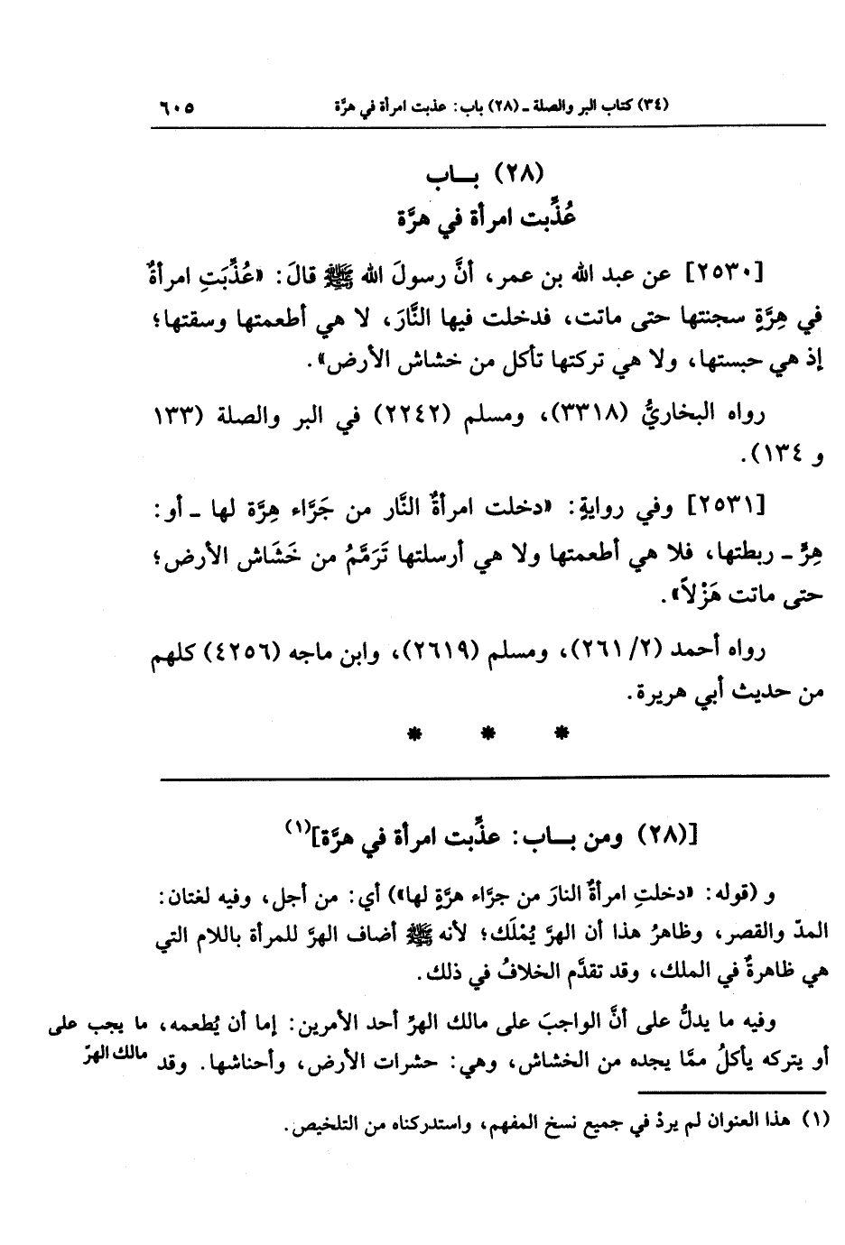 [2530] عَن عَبدِ اللَّهِ بن عمر، أَنَّ رَسُولَ اللَّهِ صَلَّى اللَّهُ عَلَيهِ وَسَلَّمَ قَالَ: عُذِّبَت امرَأَةٌ فِي هِرَّةٍ سَجَنَتهَا حَتَّى مَاتَت، فَدَخَلَت فِيهَا النَّارَ، لَا هِيَ أَطعَمَتهَا وَسَقَتهَا؛ إِذ هي حَبَسَتهَا، وَلَا هِيَ تَرَكَتهَا تَأكُلُ مِن خَشَاشِ الأَرضِ.