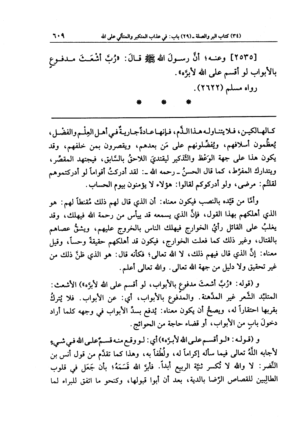 و(قوله: رب أشعث مدفوع بالأبواب، لو أقسم على الله لأبره) الأشعث: المتلبد الشعر غير المدهنه. والمدفوع بالأبواب، أي: عن الأبواب. فلا يترك بقربها احتقارا له، ويصح أن يكون معناه: يدفع بسد الأبواب في وجهه كلما أراد دخول باب من الأبواب، أو قضاء حاجة من الحوائج.