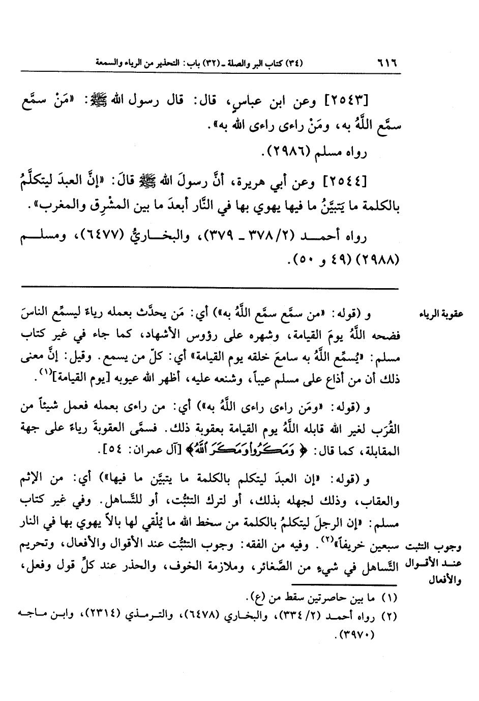 [2544] وعَن أَبِي هُرَيرَةَ: أَنَّ رَسُولَ اللَّهِ صَلَّى اللَّهُ عَلَيهِ وَسَلَّمَ قال: إِنَّ العَبدَ لَيَتَكَلَّمُ بِالكَلِمَةِ ما يتبين ما فيها يَهوي بِهَا فِي النَّارِ أَبعَدَ مَا بَينَ المَشرِقِ وَالمَغرِبِ.