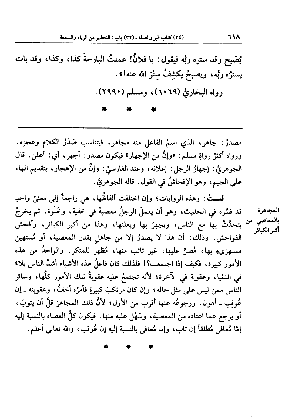 قلت: وهذه الروايات، وإن اختلفت ألفاظها، هي راجعة إلى معنى واحد قد فسره في الحديث، وهو أن يعمل الرجل معصية في خفية وخلوة، ثم يخرج يتحدث بها مع الناس، ويجهر بها ويعلنها، وهذا من أكبر الكبائر وأفحش الفواحش. وذلك أن هذا لا يصدر إلا من جاهل بقدر المعصية، أو مستهين مستهزئ بها، مصر عليها، غير تائب منها، مظهر للمنكر. والواحد من هذه الأمور كبيرة، فكيف إذا اجتمعت؟ ! فلذلك كان فاعل هذه الأشياء أشد الناس بلاء في الدنيا، وعقوبة في الآخرة، لأنَّه تجتمع عليه عقوبة تلك الأمور كلها، وسائر الناس ممن ليس على مثل حاله، وإن كان مرتكب كبيرة فأمره أخف، وعقوبته - إن عوقب - أهون، ورجوعه عنها أقرب من الأول، لأنَّ ذلك المجاهر قلّ أن يتوب، أو يرجع عما اعتاده من المعصية، وسهل عليه منها. فيكون كل العصاة بالنسبة إليه إما معافى مطلقا إن تاب، وإما معافى بالنسبة إليه إن عوقب، والله تعالى أعلم.