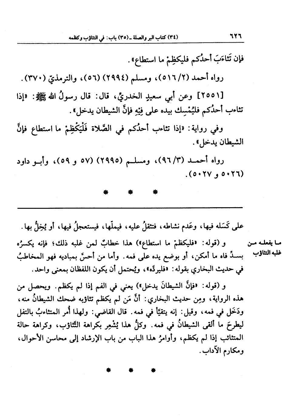 فَإِن تَثَاءَبَ أَحَدُكُم فَليَكظِم مَا استَطَاعَ.