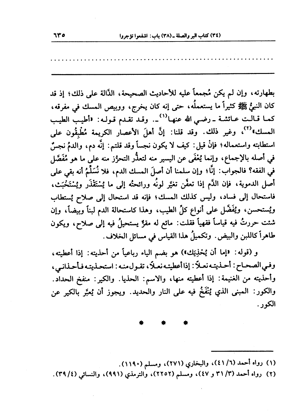 بطهارته، وإن لم يكن مجمعا عليه؛ للأحاديث الصحيحة، الدالة على ذلك؛ إذ قد كان النبي صلى الله عليه وسلم كثيرا ما يستعمله، حتى إنه كان يخرج، ووبيص المسك في مفرقه، كما قالت عائشة -رضي الله عنها (¬1) - وقد تقدم قوله: أطيب الطيب المسك (¬2)، وغير ذلك. وقد قلنا: إن أهل الأعصار الكريمة مطبقون على استطابته واستعماله؛ فإن قيل: كيف لا يكون نجسا وقد قلتم: إنه دم، والدم نجس في أصله بالإجماع، وإنما يعفى عن اليسير منه لتعذر التحرز منه على ما هو مفصل في الفقه؟ فالجواب: إنا وإن سلمنا أن أصل المسك الدم، فلا نسلم أنه بقي على أصل الدموية، فإنَّ الدم إذا تعفن تغير لونه ورائحته إلى ما يستقذر ويستخبث، فاستحال إلى فساد، وليس كذلك المسك؛ فإنَّه قد استحال إلى صلاح يستطاب ويستحسن، ويفضل على أنواع كل الطيب، وهذا كاستحالة الدم لبنا وبيضا، وإن شئت حررت فيه قياسا فقهيا فقلت: مائع له مقر يستحيل فيه إلى صلاح، ويكون طاهرا كاللبن والبيض. وتكميل هذا القياس في مسائل الخلاف.