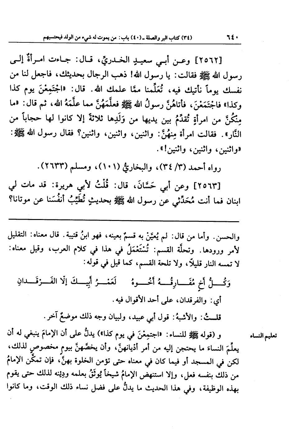[2562] وعَن أَبِي سَعِيدٍ الخُدرِيِّ قَالَ: جَاءَت امرَأَةٌ إِلَى رَسُولِ اللَّهِ صَلَّى اللَّهُ عَلَيهِ وَسَلَّمَ فَقَالَت: يَا رَسُولَ اللَّهِ، ذَهَبَ الرِّجَالُ بِحَدِيثِكَ، فَاجعَل لَنَا مِن نَفسِكَ يَومًا نَأتِيكَ فِيهِ، تُعَلِّمُنَا مِمَّا عَلَّمَكَ اللَّهُ. قَالَ: اجتَمِعنَ يَومَ كَذَا وَكَذَا، فَاجتَمَعنَ، فَأَتَاهُنَّ رَسُولُ اللَّهِ صَلَّى اللَّهُ عَلَيهِ وَسَلَّمَ فَعَلَّمَهُنَّ مِمَّا عَلَّمَهُ اللَّهُ، ثُمَّ قَالَ: مَا مِنكُنَّ مِن امرَأَةٍ تُقَدِّمُ بَينَ يَدَيهَا مِن وَلَدِهَا ثَلَاثَةً إِلَّا كَانُوا لَهَا حِجَابًا مِن النَّارِ. فَقَالَت امرَأَةٌ منهن: وَاثنَينِ، وَاثنَينِ، وَاثنَينِ؟ فَقَالَ رَسُولُ اللَّهِ صَلَّى اللَّهُ عَلَيهِ وَسَلَّمَ: وَاثنَينِ، وَاثنَينِ، وَاثنَينِ.