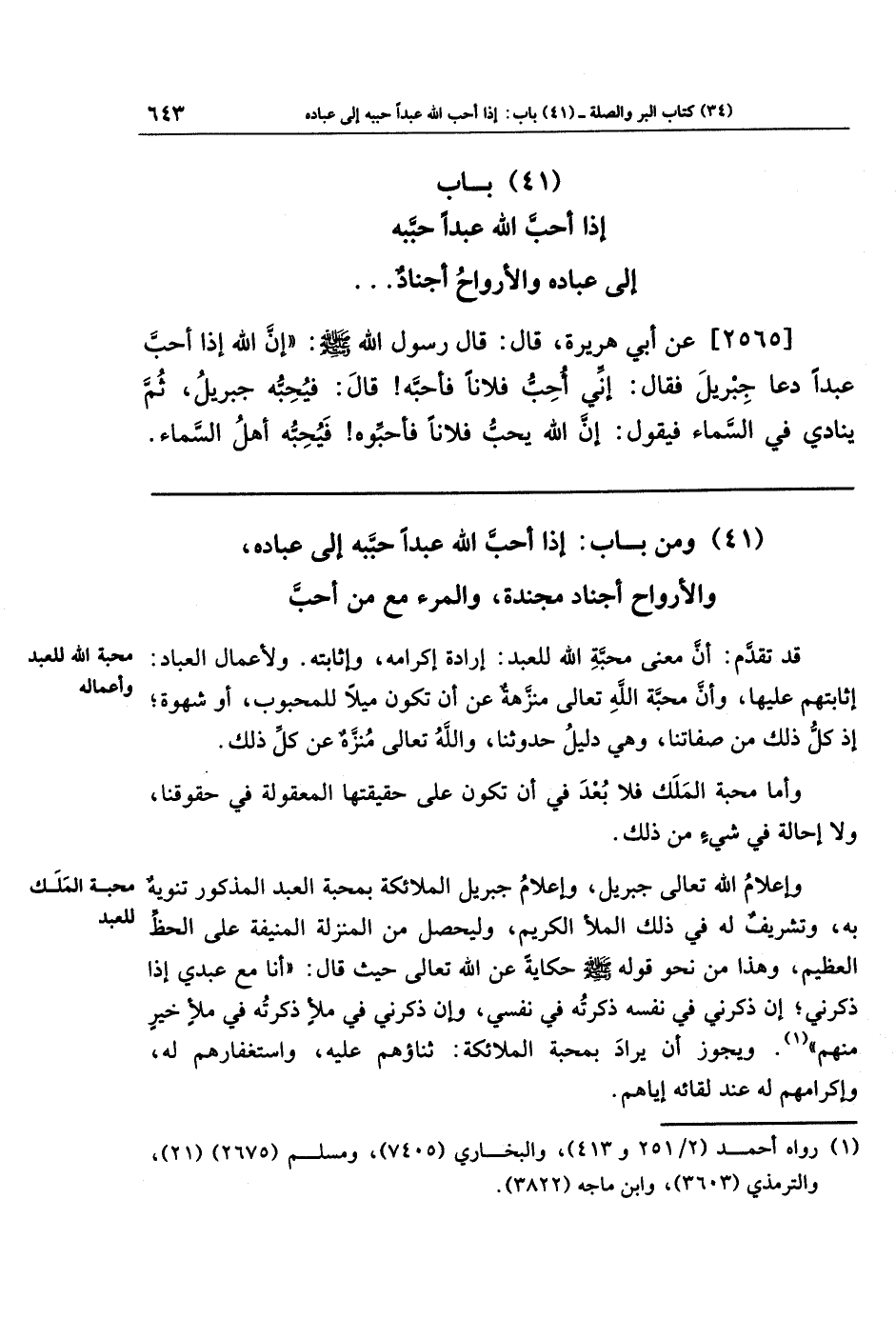 [2565] عَن أَبِي هُرَيرَةَ قَالَ: قَالَ رَسُولُ اللَّهِ صَلَّى اللَّهُ عَلَيهِ وَسَلَّمَ: إِنَّ اللَّهَ إِذَا أَحَبَّ عَبدًا دَعَا جِبرِيلَ فَقَالَ: إِنِّي أُحِبُّ فُلَانًا فَأَحِبَّهُ، قَالَ: فَيُحِبُّهُ جِبرِيلُ، ثُمَّ يُنَادِي فِي السَّمَاءِ فَيَقُولُ: إِنَّ اللَّهَ يُحِبُّ فُلَانًا فَأَحِبُّوهُ، فَيُحِبُّهُ أَهلُ السَّمَاءِ.