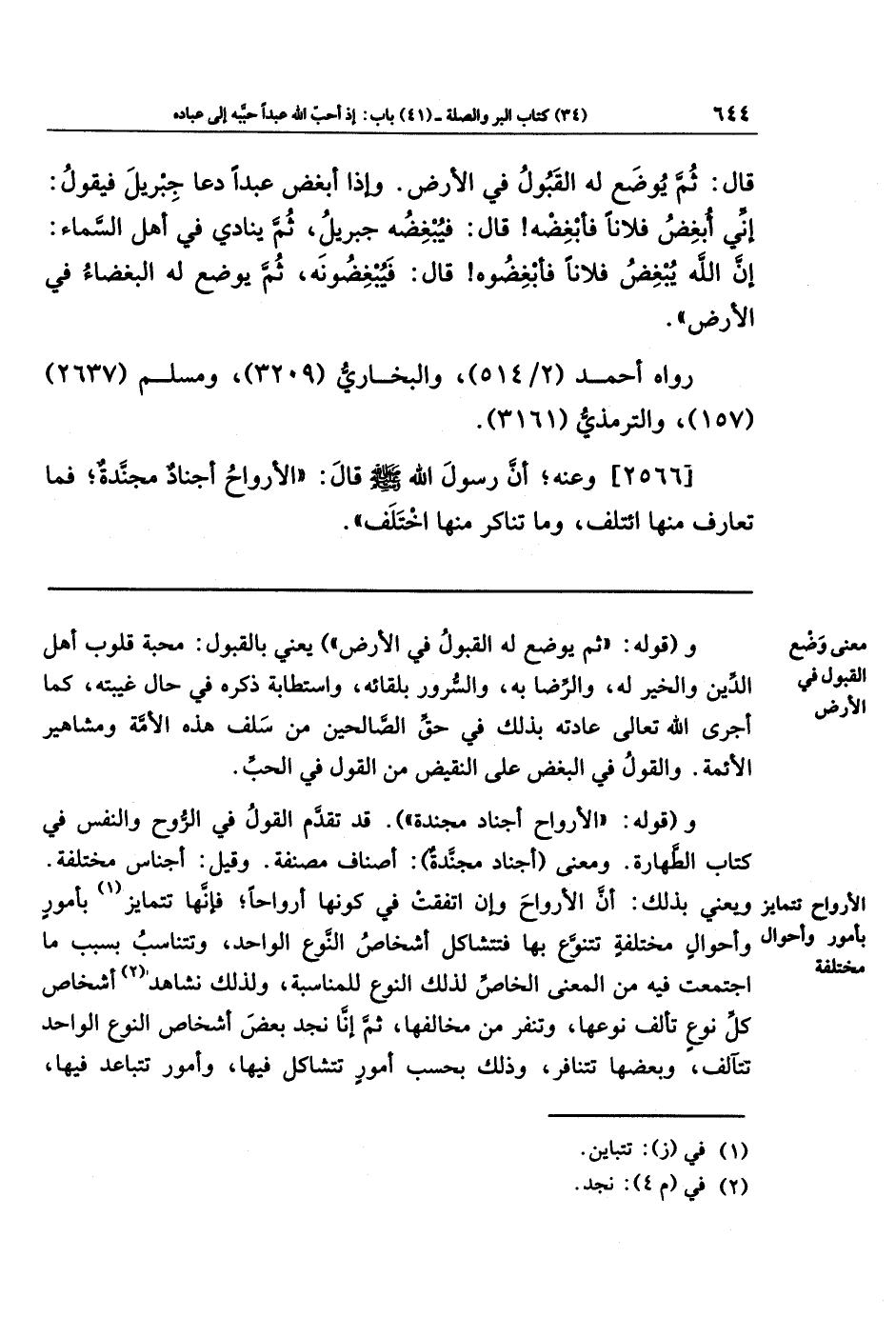 و(قوله: الأرواح أجناد مجندة). قد تقدَّم القول في الروح والنفس في كتاب الطهارة. ومعنى أجناد مجندة: أصناف مصنفة. وقيل: أجناس مختلفة. ويعني بذلك أن الأرواح وإن اتفقت في كونها أرواحا؛ فإنَّها تتمايز (¬1) بأمور وأحوال مختلفة تتنوع بها فتتشاكل أشخاص النوع الواحد، وتتناسب بسبب ما اجتمعت فيه من المعنى الخاص لذلك النوع للمناسبة، ولذلك نشاهد (¬2) أشخاص كل نوع تألف نوعها، وتنفر من مخالفها، ثمَّ إنا نجد بعض أشخاص النوع الواحد تتآلف، وبعضها تتنافر، وذلك بحسب أمور تتشاكل فيها، وأمور تتباعد فيها،