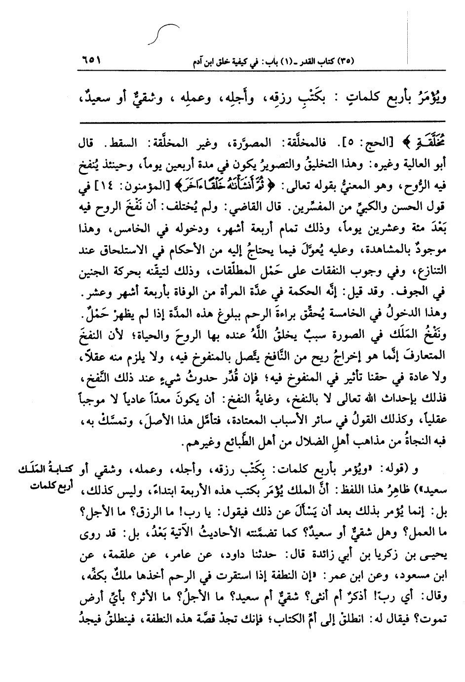 وَيُؤمَرُ بِأَربَعِ كَلِمَاتٍ: بِكَتبِ رِزقِهِ وَأَجَلِهِ وَعَمَلِهِ، وَشَقِيٌّ أَو سَعِيدٌ،