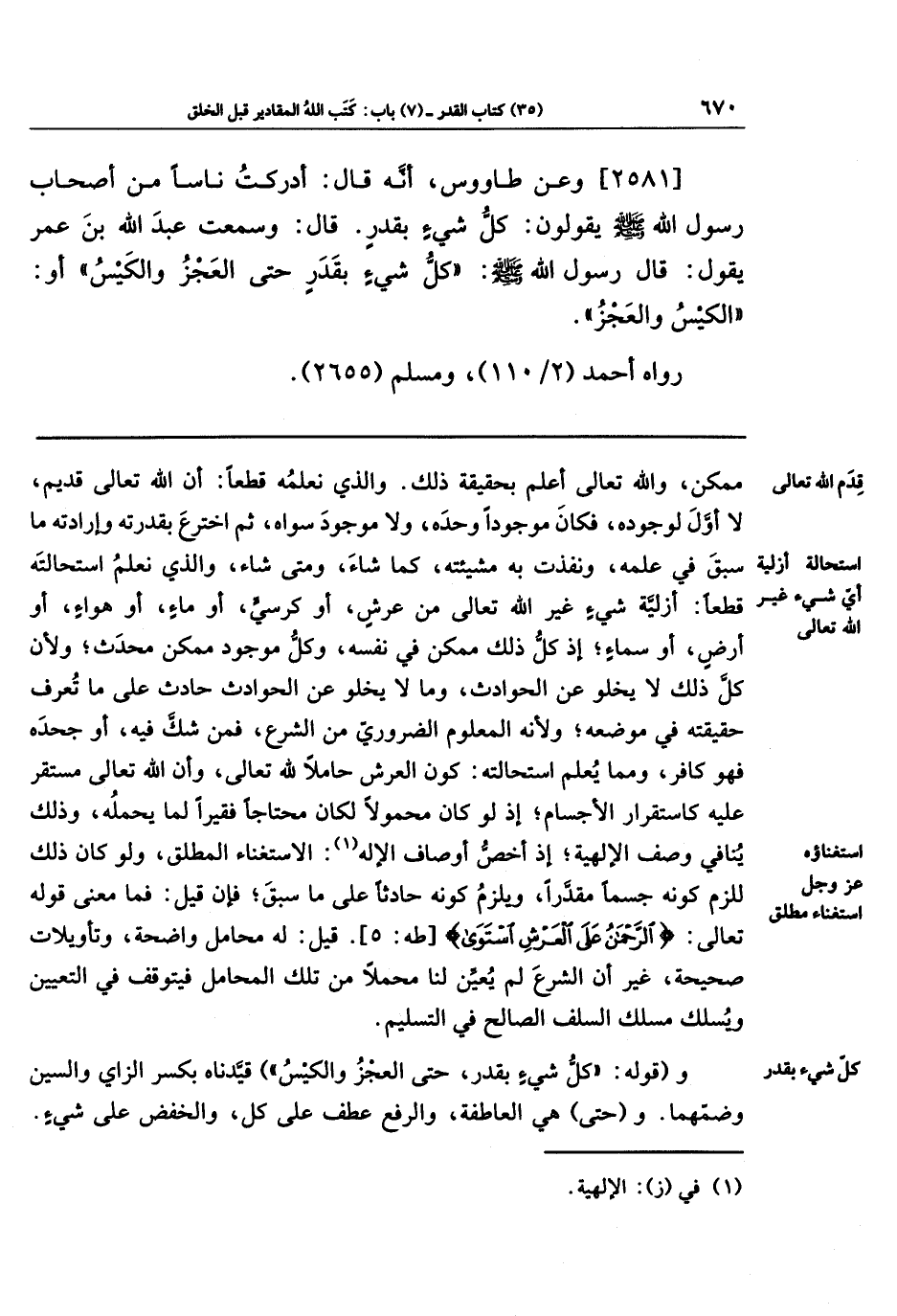 [2581] وعَن طَاوُسٍ: أَنَّهُ قَالَ: أَدرَكتُ نَاسًا مِن أَصحَابِ رَسُولِ اللَّهِ صَلَّى اللَّهُ عَلَيهِ وَسَلَّمَ يَقُولُونَ: كُلُّ شَيءٍ بِقَدَرٍ. قَالَ: وَسَمِعتُ عَبدَ اللَّهِ بنَ عُمَرَ يَقُولُ: قَالَ رَسُولُ اللَّهِ صَلَّى اللَّهُ عَلَيهِ وَسَلَّمَ: كُلُّ شَيءٍ بِقَدَرٍ حَتَّى العَجزِ وَالكَيسِ، أَو الكَيسِ وَالعَجزِ.