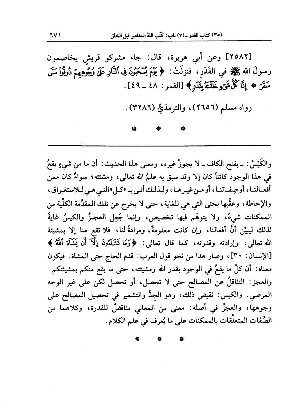 [2582] وعَن أَبِي هُرَيرَةَ قَالَ: جَاءَ مُشرِكُو قُرَيشٍ يُخَاصِمُونَ رَسُولَ اللَّهِ صَلَّى اللَّهُ عَلَيهِ وَسَلَّمَ فِي القَدَرِ فَنَزَلَت: {يَومَ يُسحَبُونَ فِي النَّارِ عَلَى وُجُوهِهِم ذُوقُوا مَسَّ سَقَرَ * إِنَّا كُلَّ شَيءٍ خَلَقنَاهُ بِقَدَرٍ}