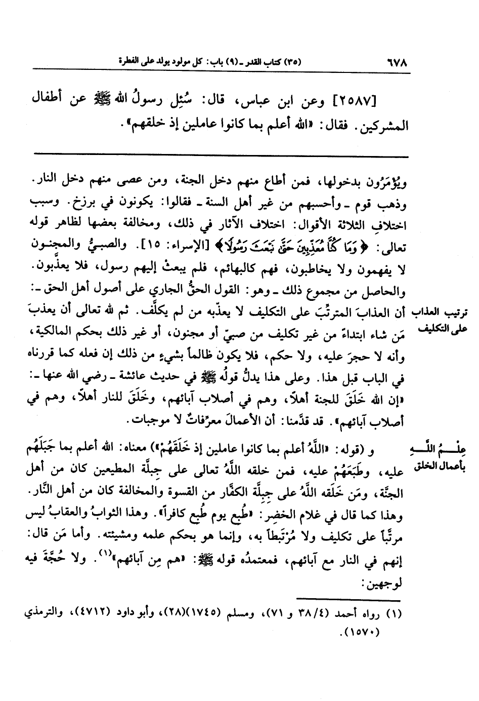 [2587] وعَن ابنِ عَبَّاسٍ قَالَ: سُئِلَ رَسُولُ اللَّهِ صَلَّى اللَّهُ عَلَيهِ وَسَلَّمَ عَن أَطفَالِ المُشرِكِينَ فقَالَ: اللَّهُ أَعلَمُ بِمَا كَانُوا عَامِلِينَ إِذ خَلَقَهُم.