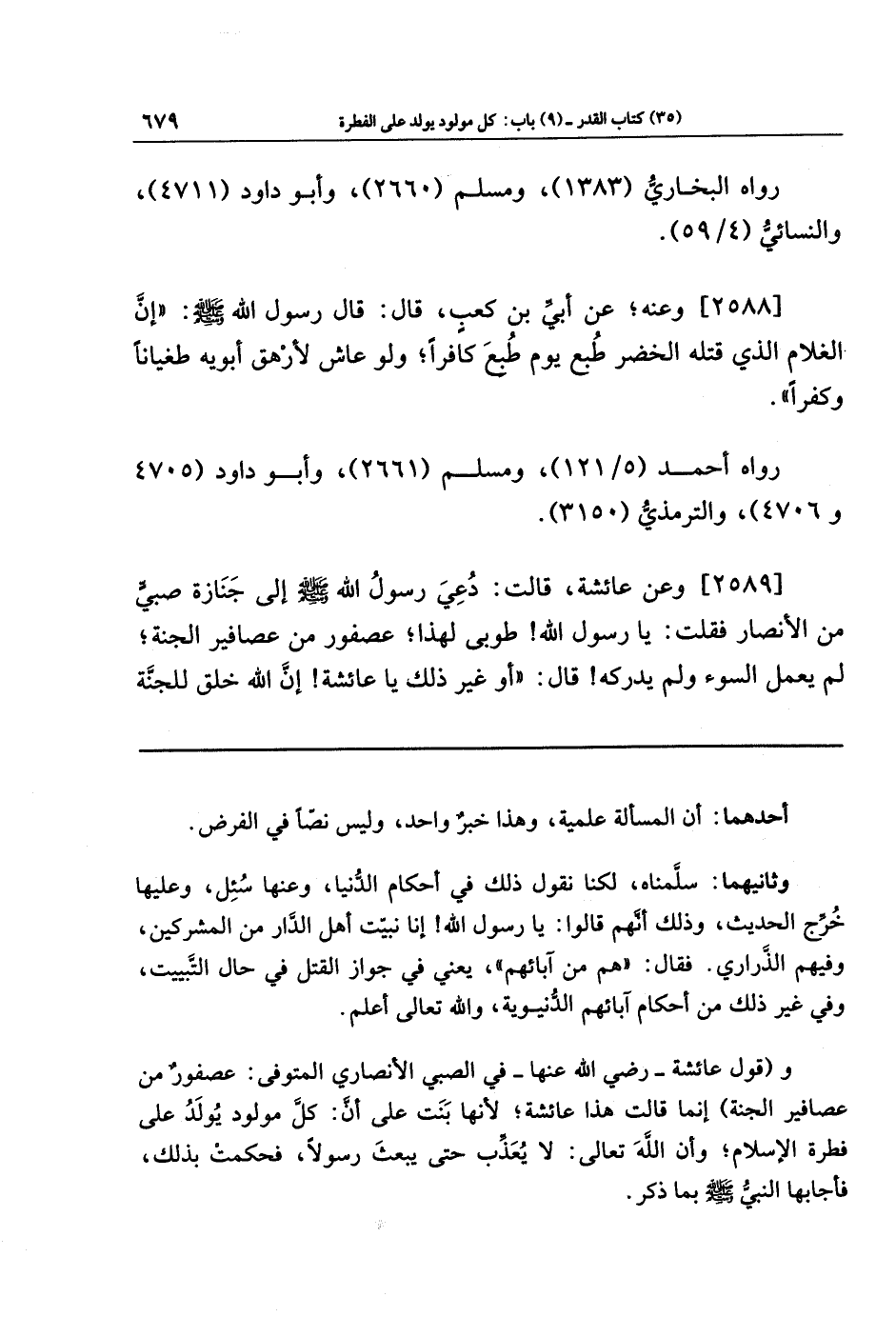 [2588] وعنه؛ عَن أُبَيِّ بنِ كَعبٍ قَالَ: قَالَ رَسُولُ اللَّهِ صَلَّى اللَّهُ عَلَيهِ وَسَلَّمَ: إِنَّ الغُلَامَ الَّذِي قَتَلَهُ الخَضِرُ طُبِعَ يوم طبع كَافِرًا، وَلَو عَاشَ لَأَرهَقَ أَبَوَيهِ طُغيَانًا وَكُفرًا.