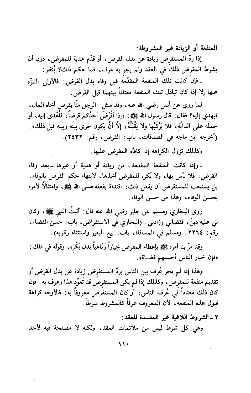 روى البخاري ومسلم عن جابر رضي الله عنه قال: أتيتُ النبي - صلى الله عليه وسلم -، وكان لي عليه دينُ، فقضاني وزادني (البخاري في الاستقراض، باب: حسن القضاء، رقم2264. ومسلم في المساقاة، باب: بيع البعير واستثناء ركوبه).