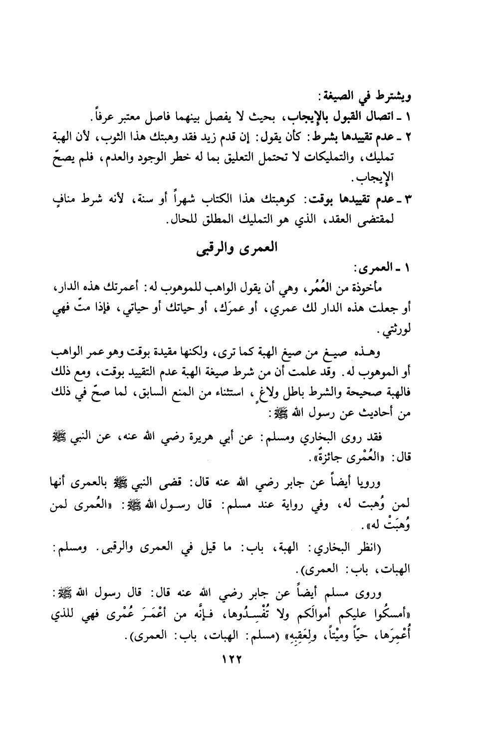 وهذه صيغ من صيغ الهبة كما ترى، ولكنها مقيدة بوقت وهو عمر الواهب أو الموهوب له. وقد علمت أن من شرط صيغة الهبة عدم التقييد بوقت، ومع ذلك فالهبة صحيحة والشرط باطل ولاغٍ، استثناء من المنع السابق، لما صحّ في ذلك من أحاديث عن رسول الله - صلى الله عليه وسلم -.