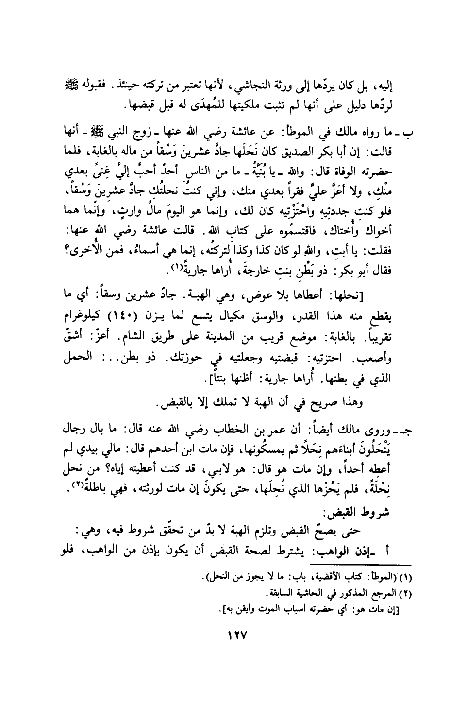 ب - ما رواه مالك في الموطأ: عن عائشة رضي الله عنها - زوج النبي - صلى الله عليه وسلم - أنها قالت: إن أبا بكر الصديق كان نَحَلَها جادَّ عشرينَ وَسْقا من ماله بالغابة، فلما حضرته الوفاة قال: والله - يا بُنَّيُه - ما من الناس أحد أحبَّ إلى غنى بعدي مْنك، ولا أعَزَّ عليَّ فقراً بعدي منك، وإني كنتُ نحلتك جادَّ عشرين وسْقاً، فلو كنت جددتيه، واحتزتيه كان لك، وإنما هو اليوم مال وارثٍ، وإنّما هما أخواك وأُختاك، فاقتسموه على كتاب الله. قالت عائشة رضي الله عنها: فقلت: يا أبت، والله لو كان كذا وكذا بتركته، إنما هي أسماءُ، فمن الأُخرى؟ فقال أبو بكر: ذو بَطْن بنت خارجة، أراها جارية (¬1).