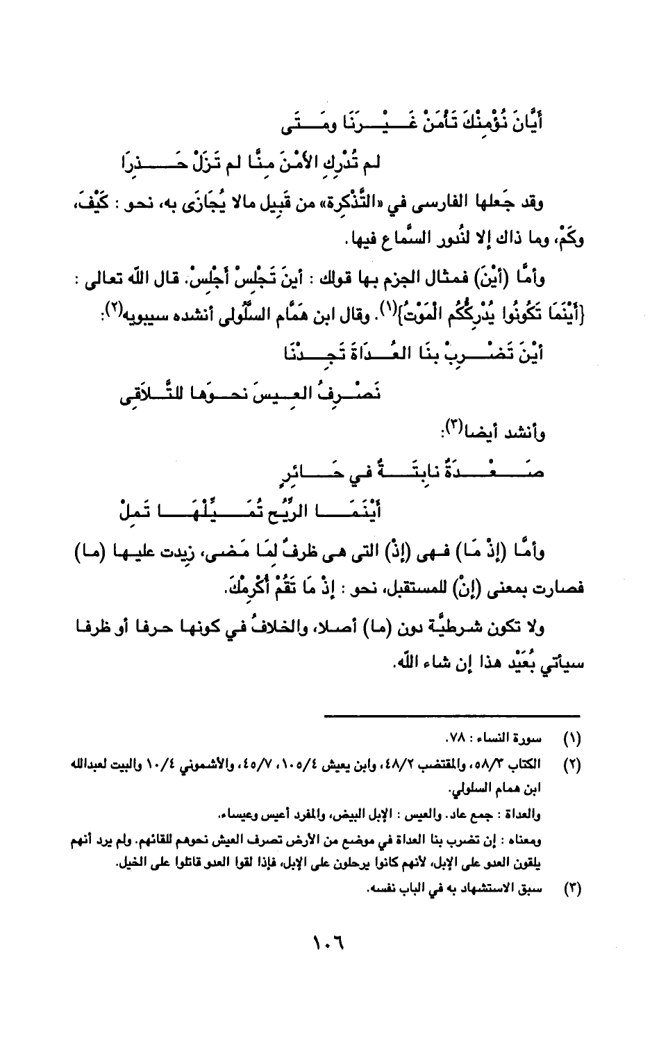 وأما (أين) فمثال الجزم بها قولك: أين تجلس أجلس. قال الله تعالى: } أينما تكونوا يدرككم الموت}. وقال ابن همام السلولي أنشده سيبويه: