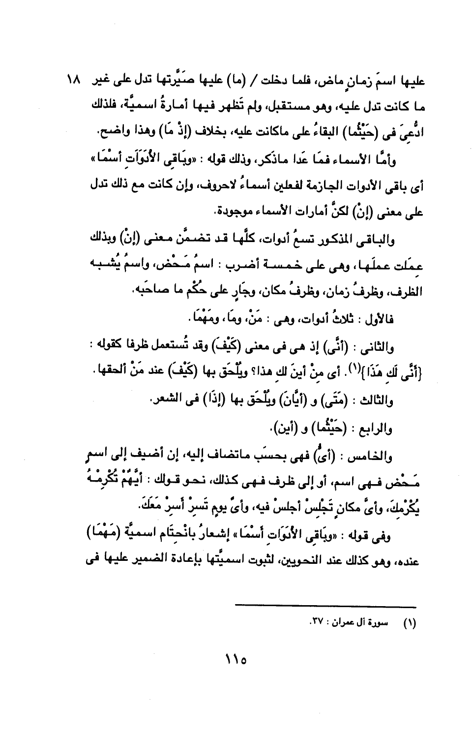 والباقي المذكور تسع أدوات، كلها قد تضمن معنى (إن) وبذلك عملت عملها، وهي على خمسة أضرب: اسم محض، واسم يشبه الظرف، وظرف زمان، وظرف مكان، وجار على حكم ما صاحبه.