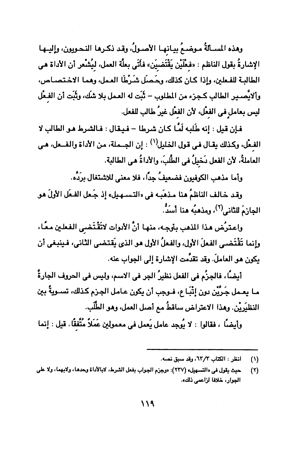 وهذه المسألة موضع بيانها الأصول، وقد ذكرها النوحويون، وإليها الإشارة بقول الناظم: "فعلين يقتضين" فآتي بعلة العمل، ليشعر أن الأداة هي الطالبة للفعلين، وإذا كان كذلك، وحصل شرطا العمل، وهما الاختصاص، وألا يصير الطالب كجزء من المطلوب- ثبت له العمل بلا شك، وثبت أن الفعل ليس بعامل في الفعل، لأن الفعل غير طالب للفعل.