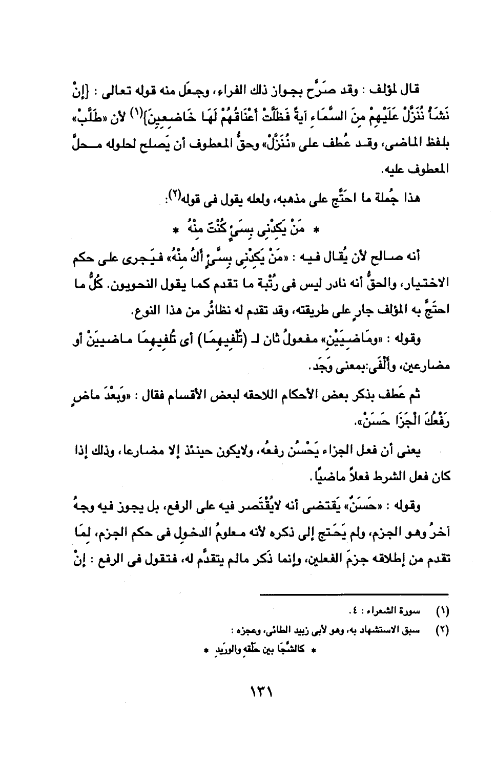 قال المؤلف: وقد صرح بجواز ذلك الفراء، وجعل منه قوله تعالى: } إن نشأ ننزل عليهم من السماء آية فظلت أعناقهم لها خاضعين} لأن "طلب" بلفظ الماضي، وقد عطف على "ننزل" وحق المعطوف أن يصلح لحلوله محل المعطوف عليه.