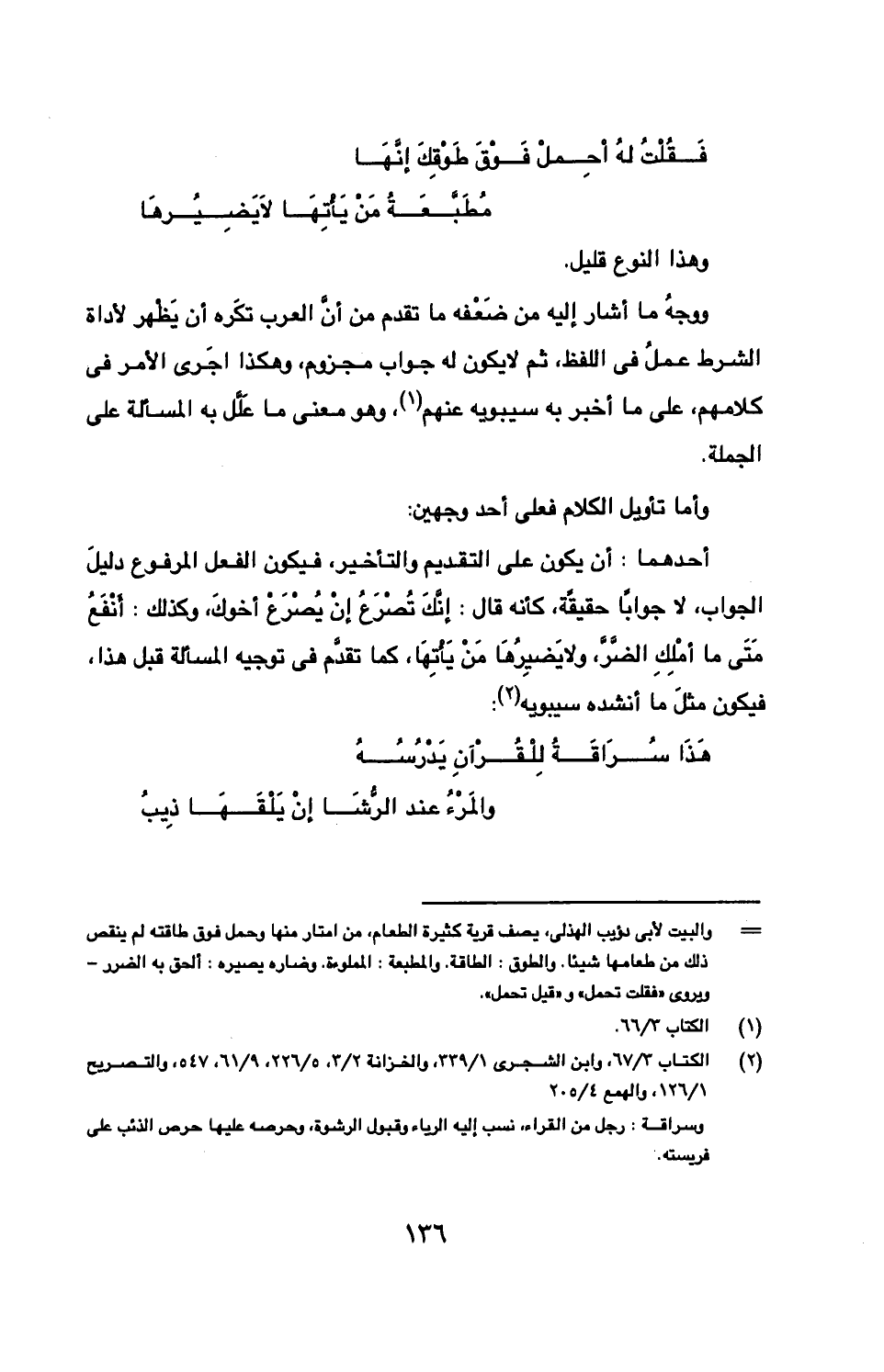 ووجه ما أشار إليه من ضعفه ما تقدم من أن العرب تكره أن يظهر لأداة الشرط عمل في اللفظ، ثم لا يكون له جواب مجزوم، وهكذا اجرى الأمر في كلامهم، على ما أخبر به سيبويه عنهم، وهو معنى ما علل به المسألة على الجملة.