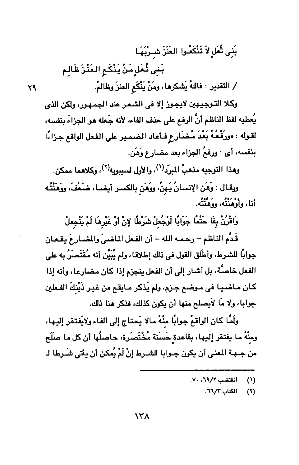 وكلا التوجيهين لا يجوز إلا في الشعر عند الجمهور، ولكن الذي يعطيه لفظ الناظم أن الرفع على حذف الفاء، لأنه جعله هو الجزاء بنفسه، لقوله: "ورفعه بعد مضارع فأعاد الضمير على الفعل الواقع جزاءا بنفسه، أي: ورفع الجزاء بعد مضارع وهن.