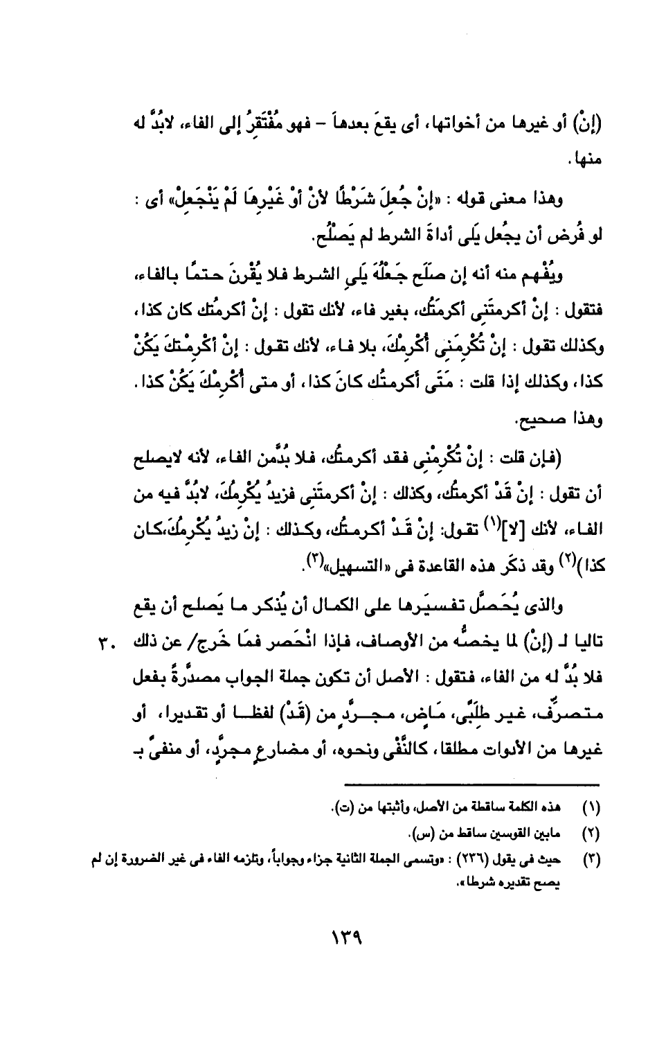 (فإن قلت: إن تكرمني فقد أكرمتك، فلا بد من الفاء، لأنه لا يصلح أن تقول: إن قد أكرمتك، وكذلك: إن أكرمتني فزيد يكرمك، لا بد فيه من الفاء، لأنك] لا [إن قد أكرمتك، وكذلك: إن زيد يكرمك، كان كذا) وقد ذكر هذه القاعدة في "التسهيل".