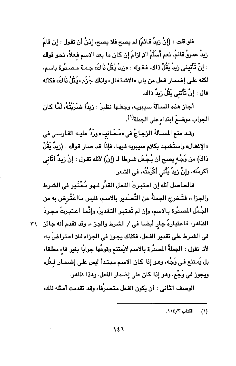 فلو قلت: (إن زيد قائم) لم يصح فلا يصح، إذن أن تقول: إن قام زيد عمرو قائم. نعم أسلم الإلزام إن كان ما بعد الاسم فعلا، نحو قولك: إن تأتيني زيد يقل ذاك. فقوله: "زيد يقل ذاك" جملة مصدرة باسم، لكنه على إضمار فعل من باب "الاشتغال" ولذلك جزم "يقل ذلك" فكأنه قال: إن تأتني يقل زيد ذاك.